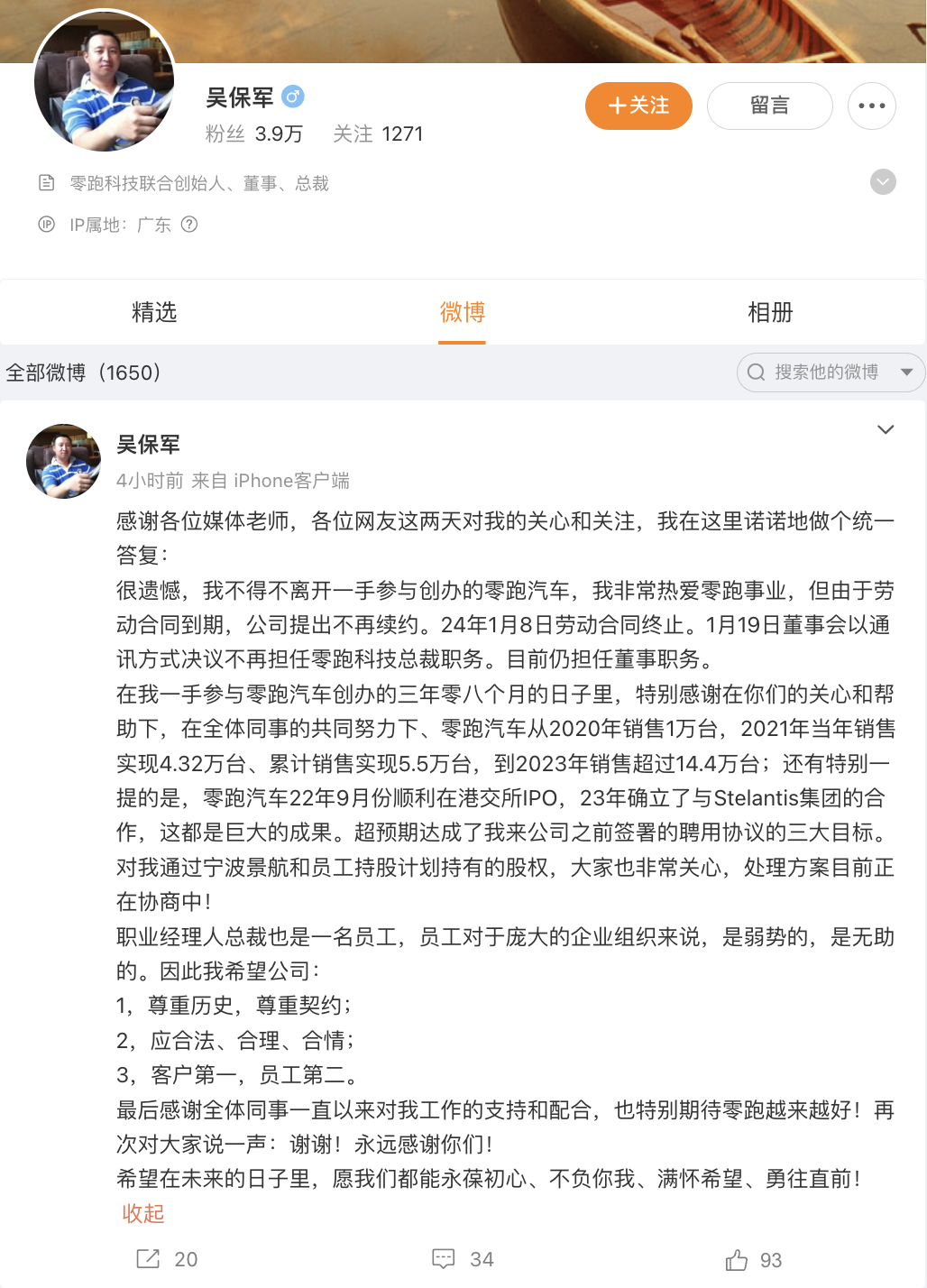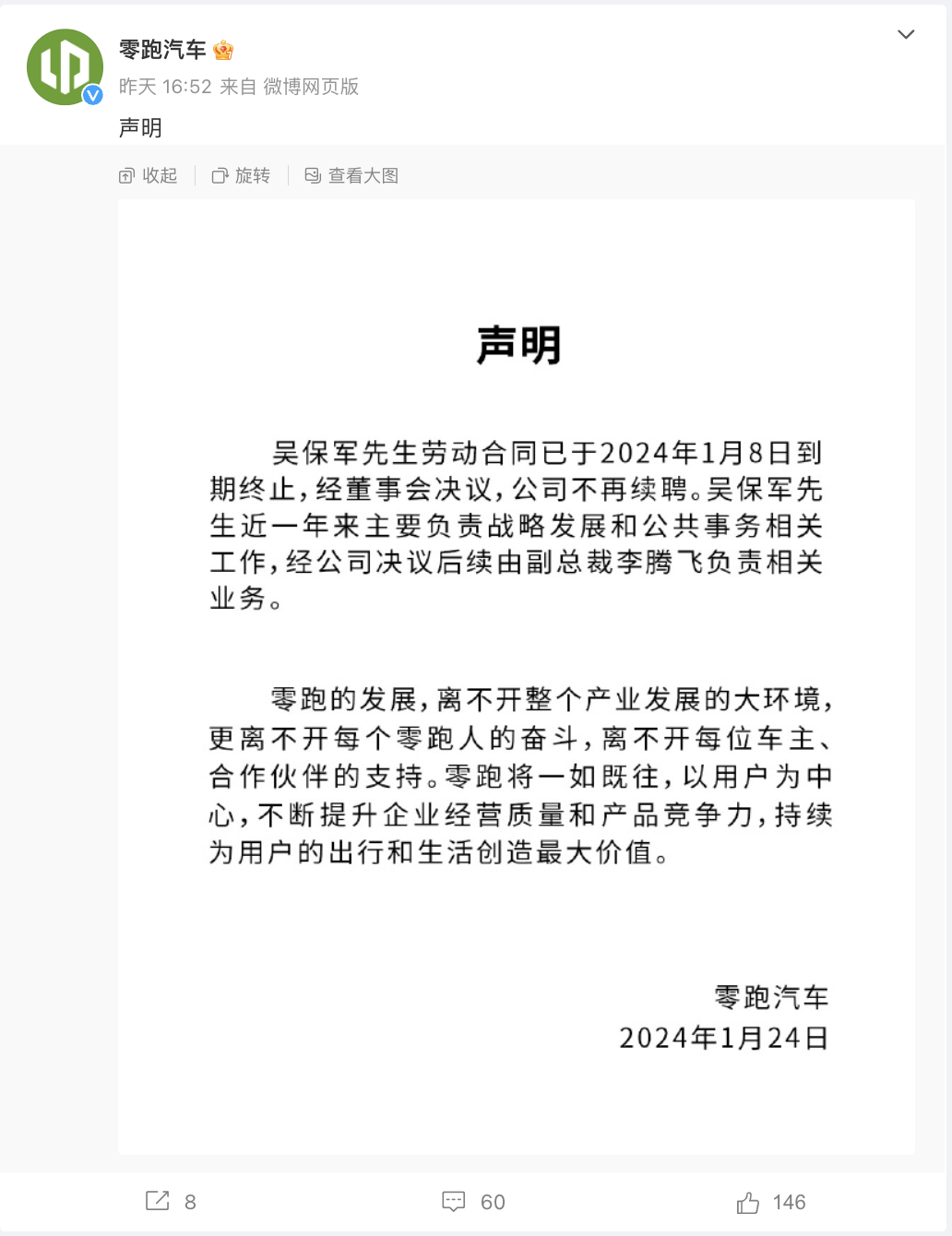 此前一天,零跑汽車也通過微博發(fā)布聲明,公開回應(yīng)了吳保軍的離職情況。據(jù)介紹,吳保軍與零跑的勞動合同已于2024年1月8日到期終止,經(jīng)董事會決議,公司不再續(xù)聘。聲明還表示,吳保軍近一年來主要負(fù)責(zé)戰(zhàn)略發(fā)展和公共事務(wù)相關(guān)工作,經(jīng)公司決議后續(xù)由副總裁李騰飛負(fù)責(zé)相關(guān)業(yè)務(wù)。