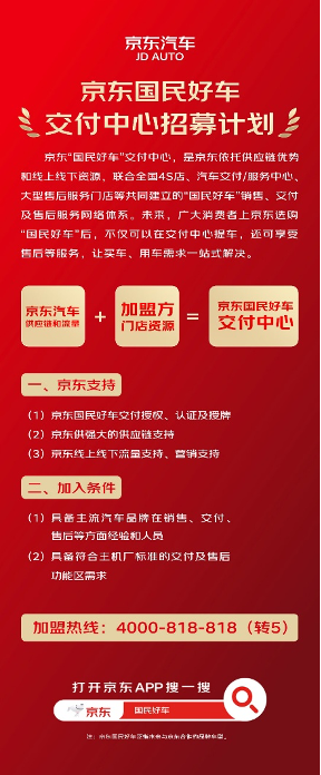 “國民好車”是京東汽車聯(lián)合主機廠、電池廠商等產(chǎn)業(yè)伙伴打造的系列化高品質(zhì)車型。其中,京東主要提供用戶消費洞察與獨家銷售服務,不直接涉及制造環(huán)節(jié)。京東汽車發(fā)起“國民好車”交付中心招募計劃,將整合資源攜手行業(yè)伙伴推進服務網(wǎng)絡落地,并助力傳統(tǒng)4S店、經(jīng)銷商等向“多品牌”店轉(zhuǎn)型。