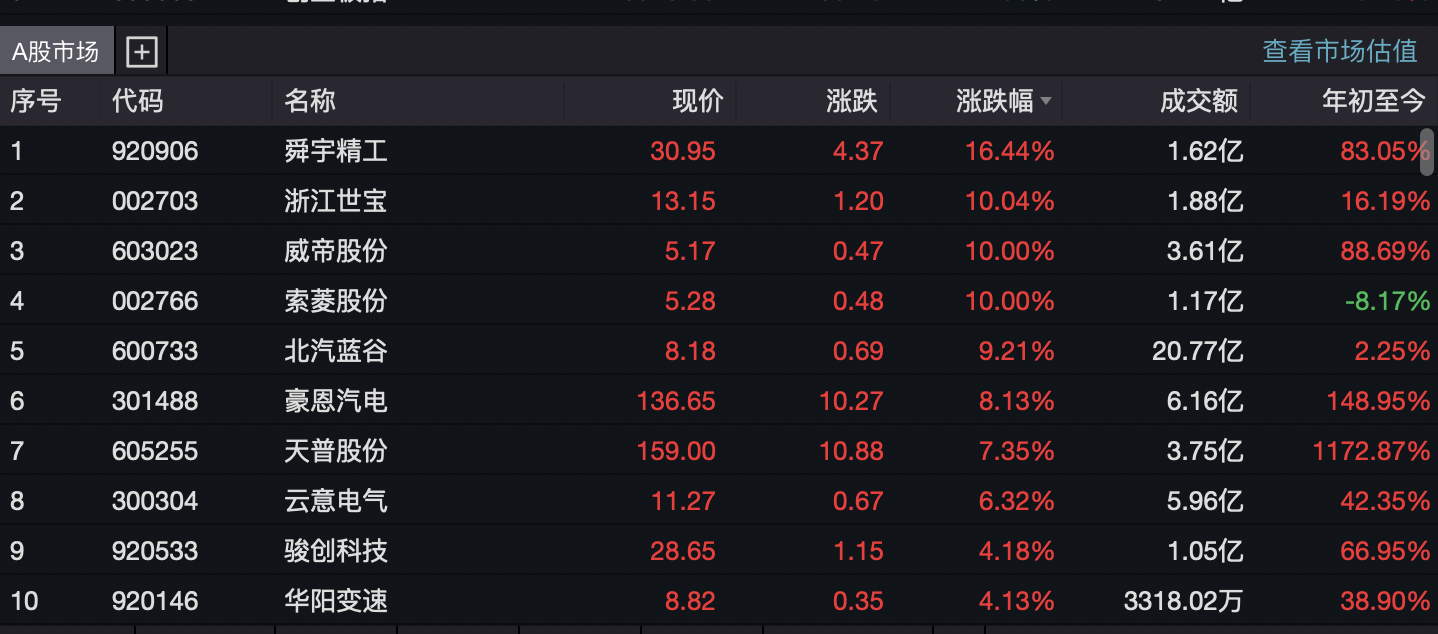 具體來(lái)看,wind資訊數(shù)據(jù)顯示,汽車與零部件板塊多股大漲,截至記者發(fā)稿時(shí),成分股中浙江世寶、威帝股份、索菱股份3股漲停,舜宇精工漲超16%,豪恩汽電、北汽藍(lán)谷、天普股份等多股跟漲,北汽藍(lán)谷逼近漲停。