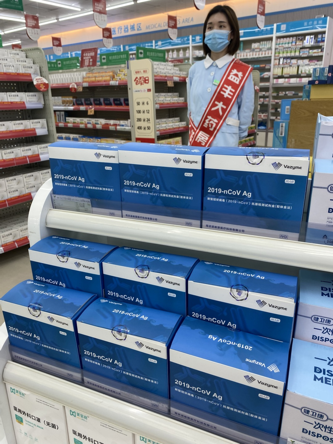 漱玉平民大藥房濟(jì)南西門店在醒目位置擺放出新冠檢測試劑盒。(攝影/趙彬彬)