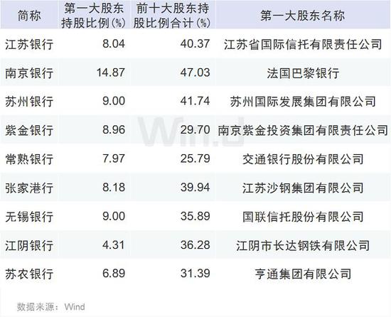 值得關(guān)注的是,江蘇A股上市的9家銀行當(dāng)中,均無控股股東和實(shí)際控制人,除南京銀行(7.830,0.11,1.42%)第一大股東法國(guó)巴黎銀行持股比例為14.87%外,其他8家銀行第一大股東持股比例均低于10%,且從前十大股東持股比例合計(jì)來看,均小于50%,如紫金銀行(6.270,0.10,1.62%)、常熟銀行(7.820,0.02,0.26%)前十大股東持股比例合計(jì)甚至不到30%。