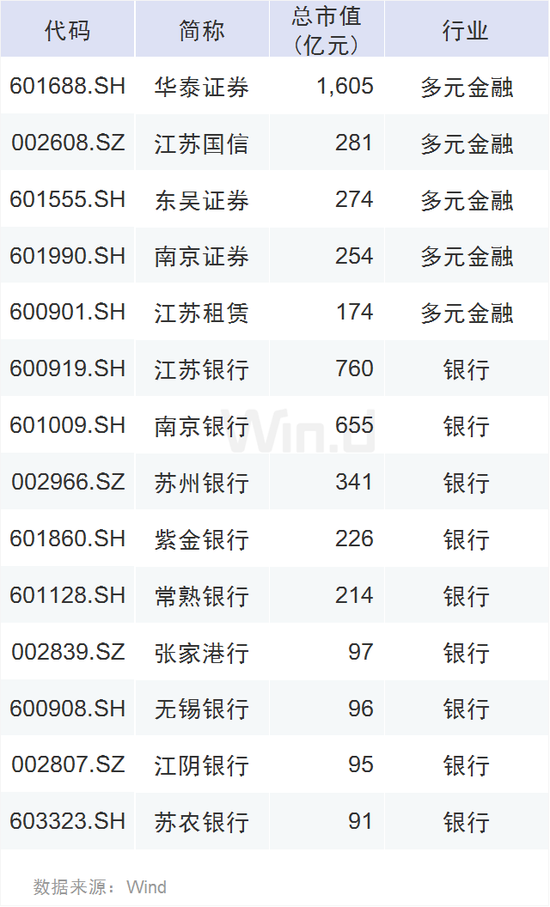 從目前上市公司情況來看,江蘇共有14家金融類上市公司,9家銀行及5家多元金融企業(yè)(包括證券、信托、金融租賃)。從相關(guān)公司總市值來看,除華泰證券(19.650,0.29,1.50%)超過1000億元以外,其余公司總市值相對(duì)較低,此外,還有4家農(nóng)商行總市值不足100億元。