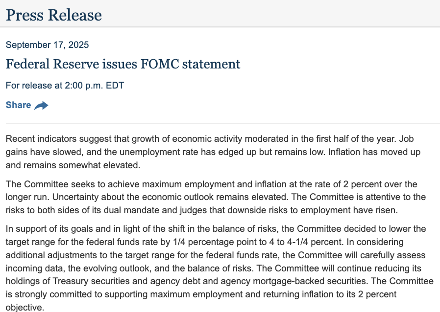 北京時間9月18日凌晨,美聯(lián)儲公布了9月份貨幣政策會議決議,宣布將聯(lián)邦基金利率目標(biāo)區(qū)間下調(diào)25個基點(diǎn)到4.00%至4.25%之間,這是美聯(lián)儲自2024年12月份以來的首次降息。