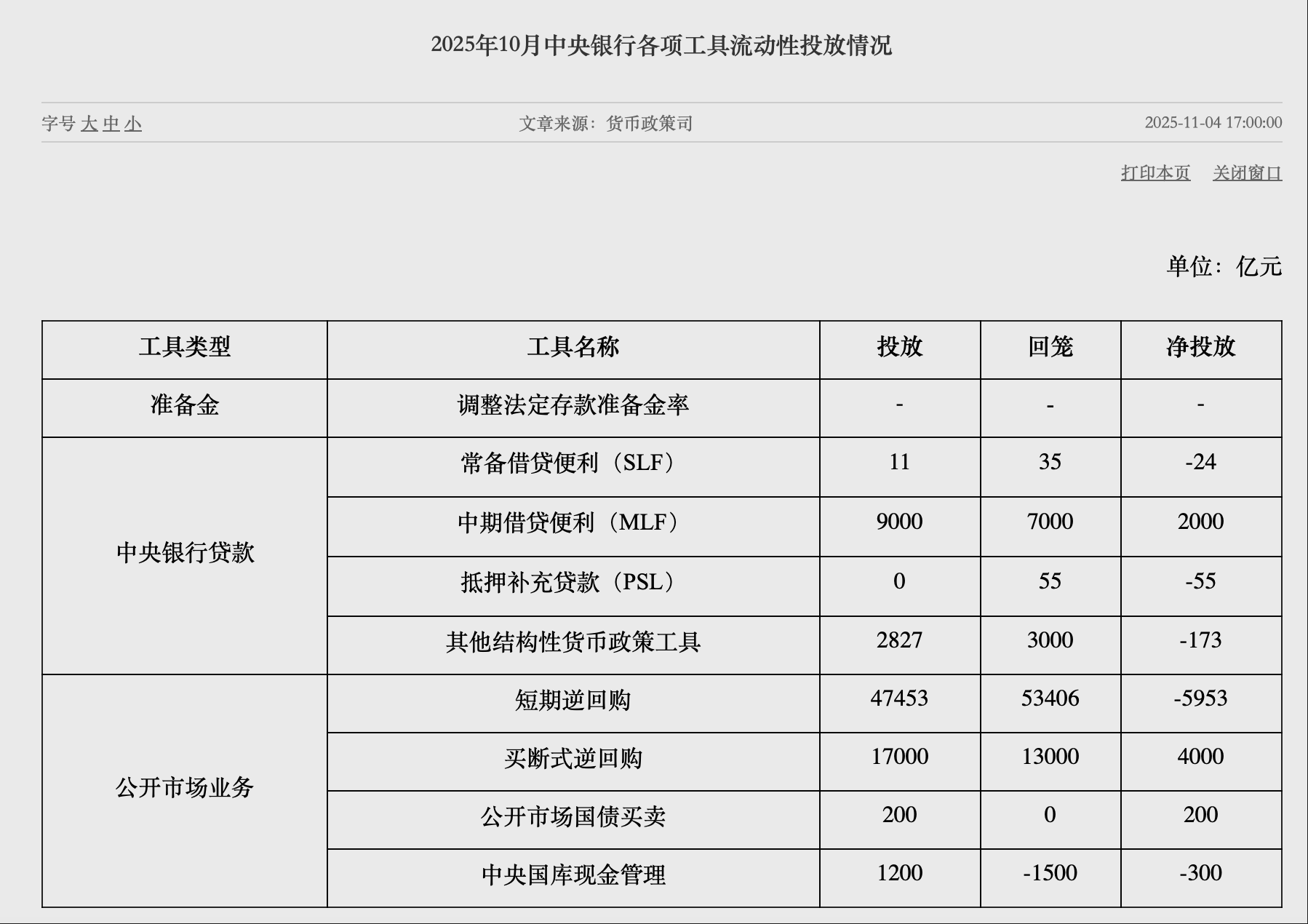 自年初暫停的公開市場國債買賣操作在10月份已經恢復。11月4日,中國人民銀行(以下簡稱“央行”)公布2025年10月中央銀行各項工具流動性投放情況。數據顯示,10月份,央行開展公開市場國債買賣操作,凈投放200億元。