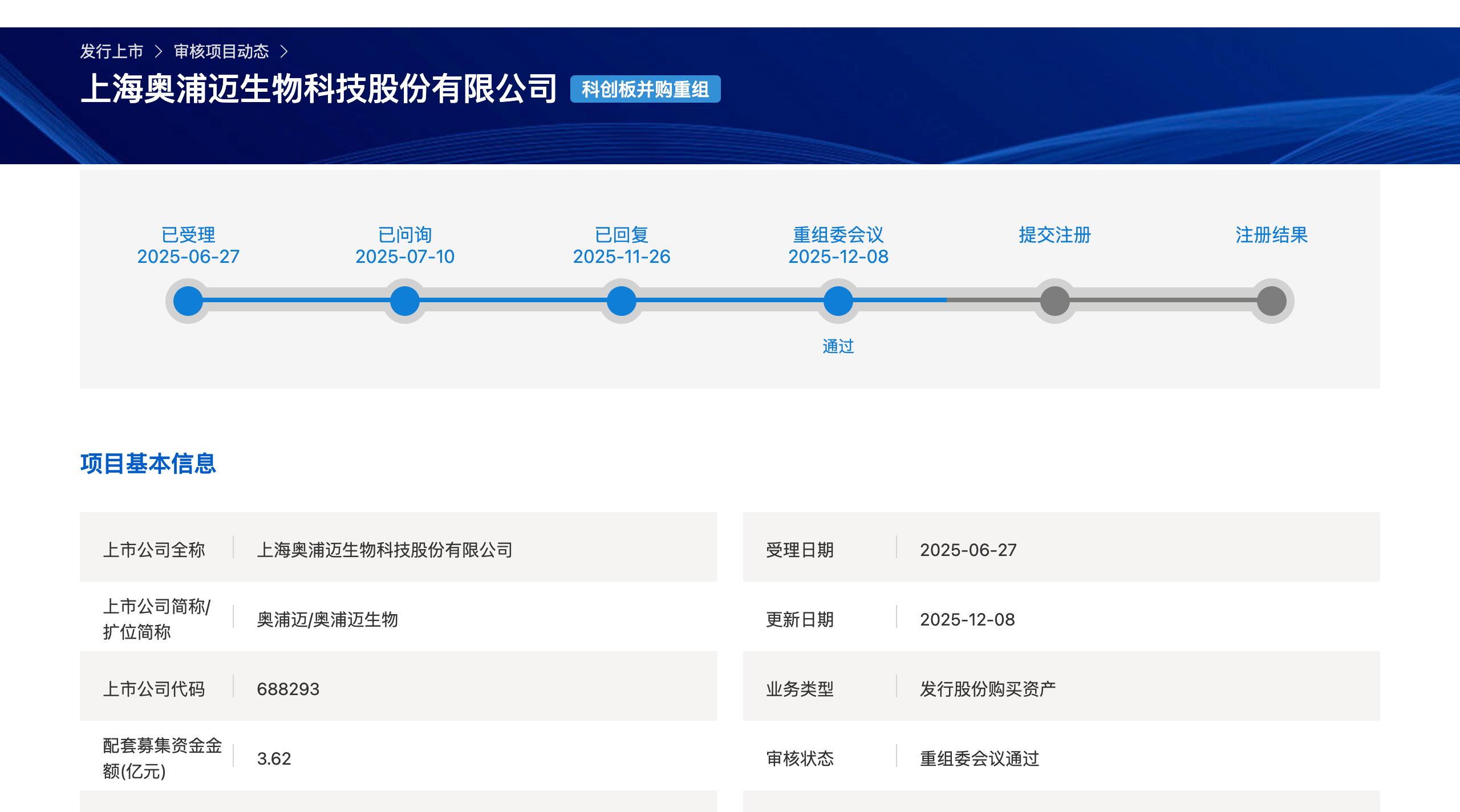 本報(bào)訊 (記者毛藝融)12月8日,上海奧浦邁生物科技股份有限公司(以下簡稱“奧浦邁”)發(fā)行股份購買資產(chǎn)申請(qǐng)獲上海證券交易所并購重組委審議通過。