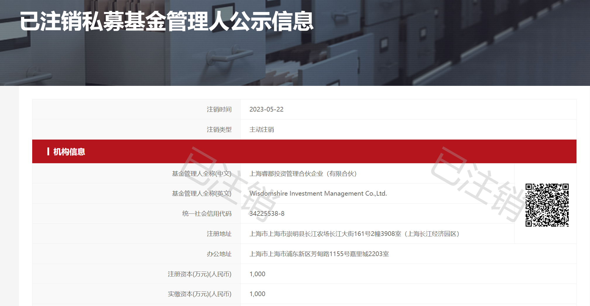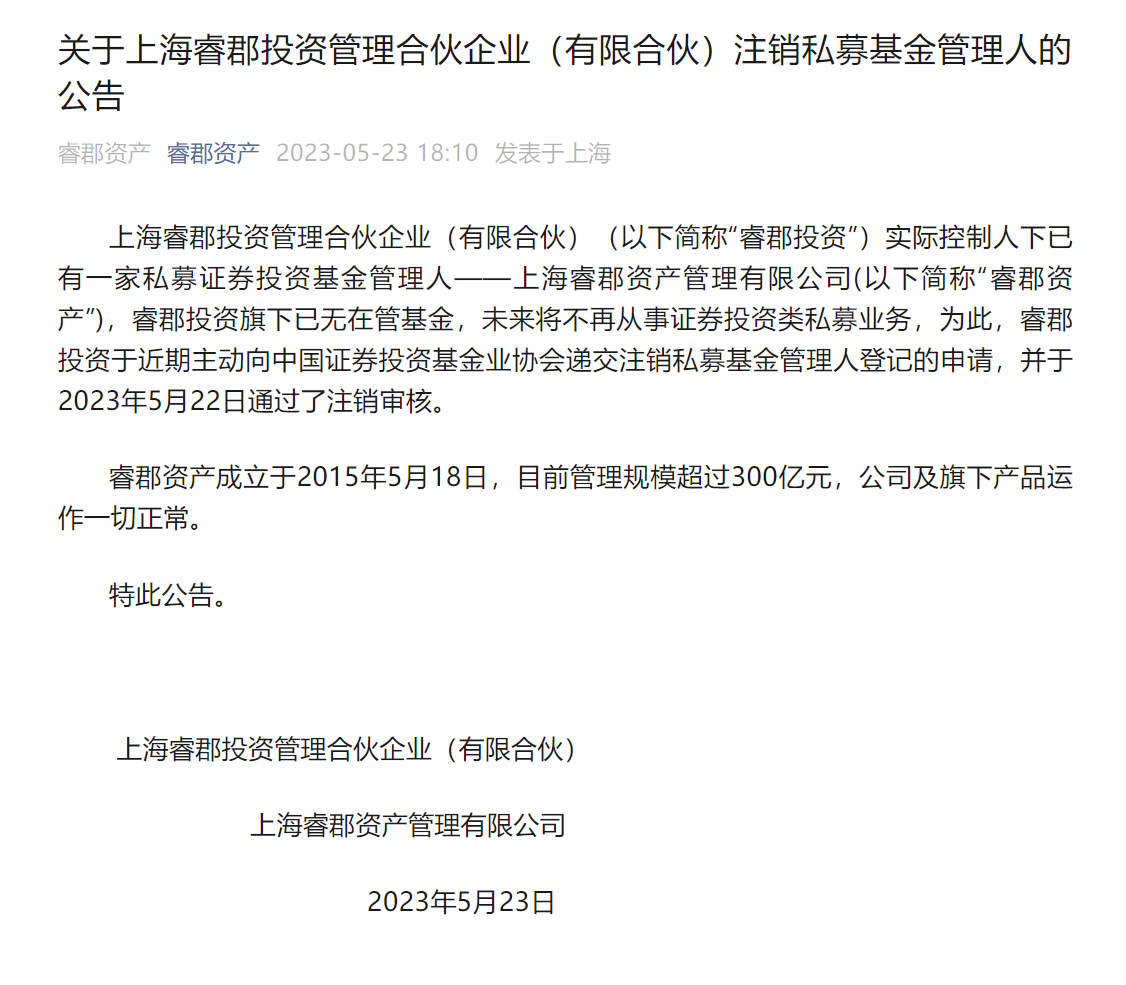 5月23日,有媒體稱,知名私募??べY產(chǎn)5月22日主動(dòng)注銷。隨后,《證券日?qǐng)?bào)》記者從中國證券投資基金業(yè)協(xié)會(huì)(以下簡稱“中基協(xié)”)信息公示處了解到,于2023年5月22日主動(dòng)注銷的私募證券基金實(shí)為上海睿郡投資管理合伙企業(yè)(有限合伙)(以下簡稱“??ね顿Y”),并非是上海??べY產(chǎn)管理有限公司(以下簡稱“睿郡資產(chǎn)”)。
