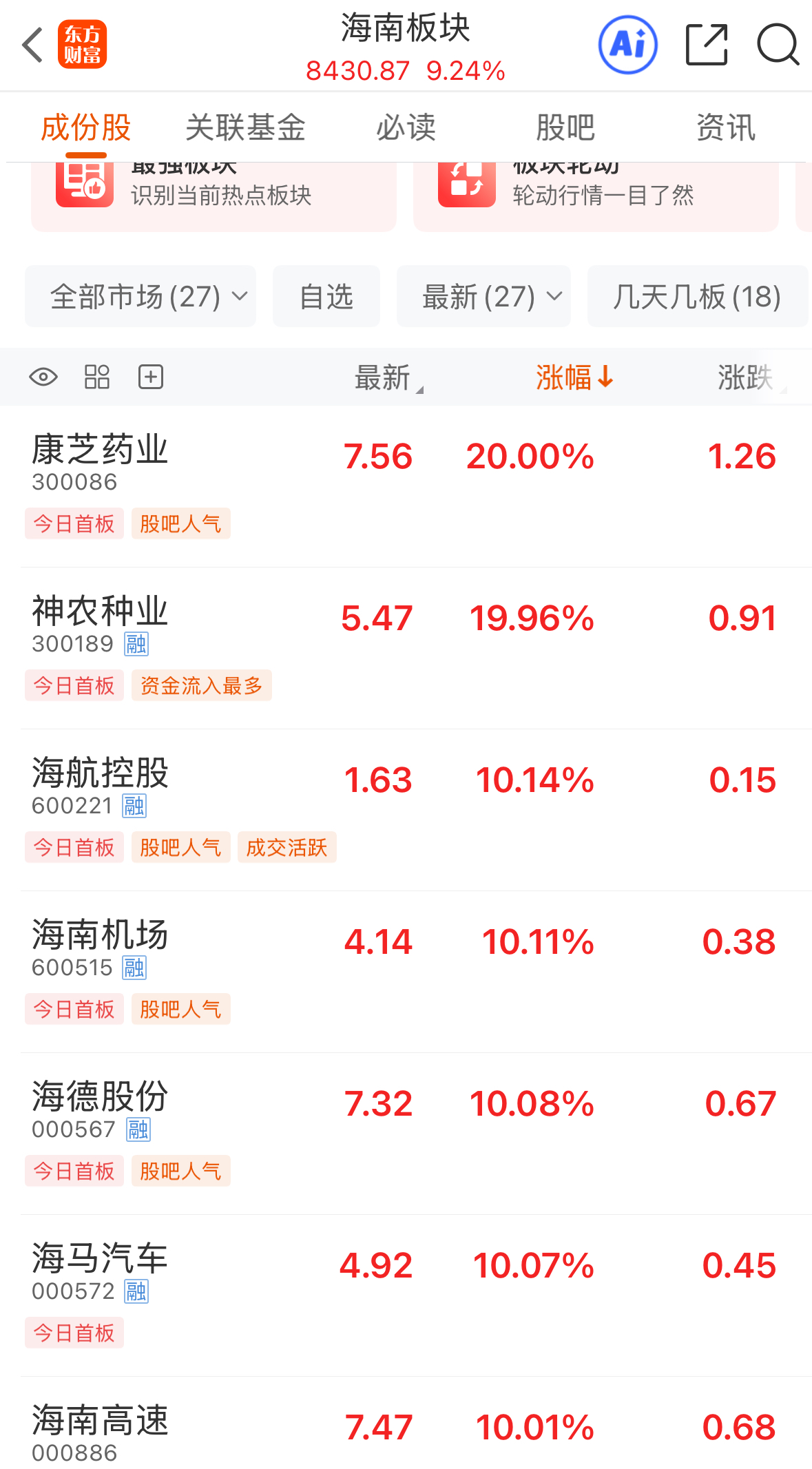 板塊中,海南相關(guān)概念板塊大漲,根據(jù)東方財(cái)富數(shù)據(jù),海南本地個(gè)股中超半數(shù)股票漲停,包括康芝藥業(yè)、海航控股、海南機(jī)場(chǎng)、海南礦業(yè)等16只個(gè)股,海南板塊整體漲幅超9%。