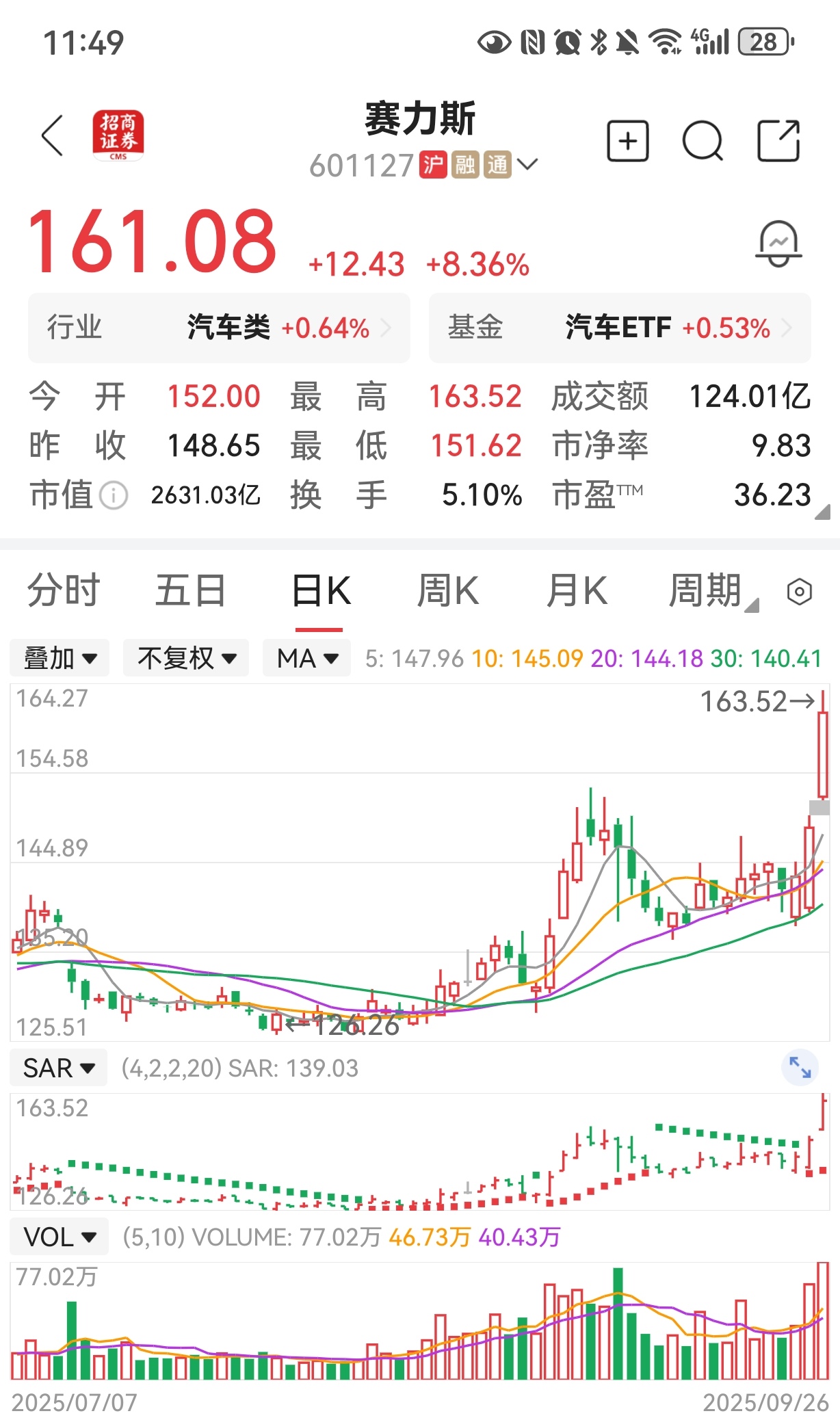 本報(bào)訊 (記者馮雨瑤)9月26日早盤時(shí)間,賽力斯股價(jià)盤中一度漲停,最高報(bào)163.52元/股,創(chuàng)歷史新高。不過,隨后公司股價(jià)打開漲停,截至上午收盤,漲幅為8.36%,股價(jià)報(bào)161.08元/股,換手率5.1%,最新市值2631億元。