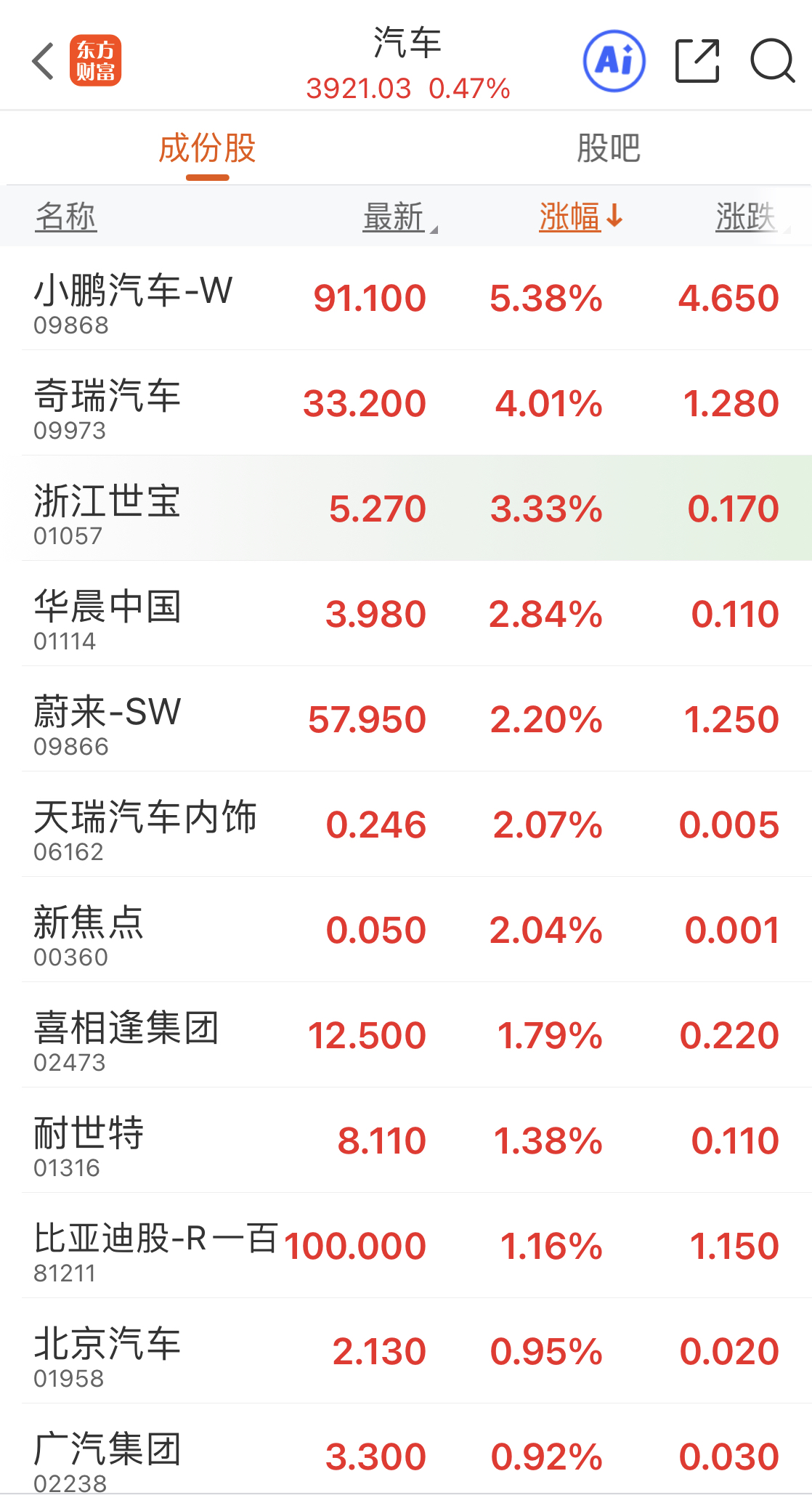 港股汽車板塊亦震蕩拉升,截至記者發(fā)稿時(shí)間,小鵬汽車-W漲超5%,奇瑞汽車漲超4%,浙江世寶、華晨中國、蔚來-SW等紛紛拉升。