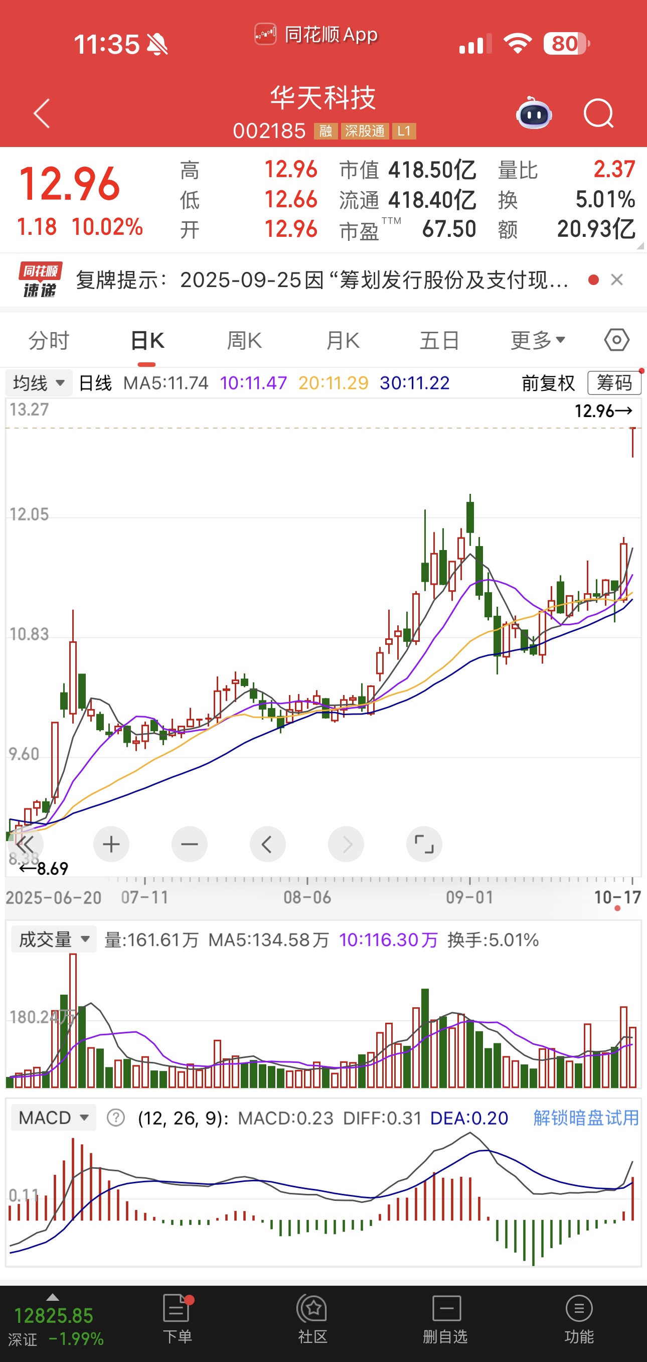 10月17日,天水華天科技股份有限公司(以下簡稱“華天科技”)復(fù)牌,開盤后漲停。截至中午收盤,封漲停價12.96元/股,漲幅為10.02%,總市值達418.5億元。