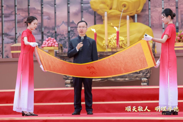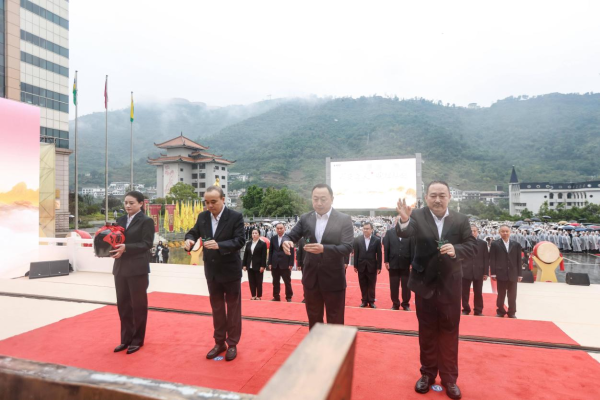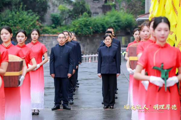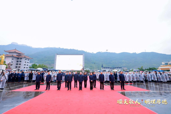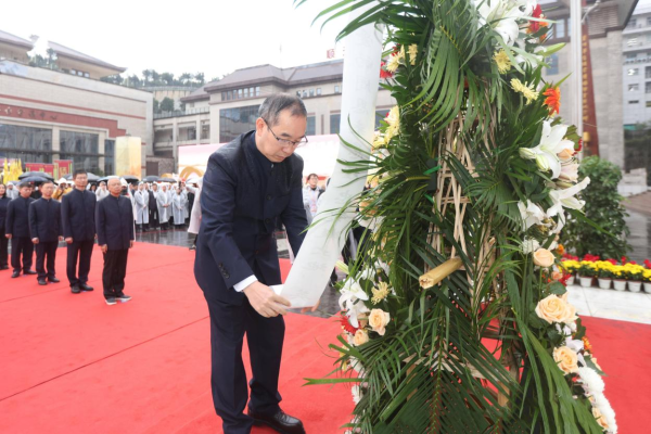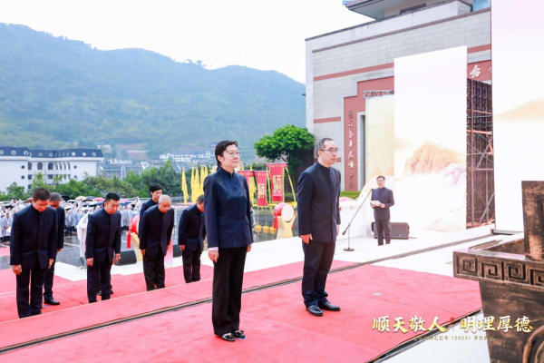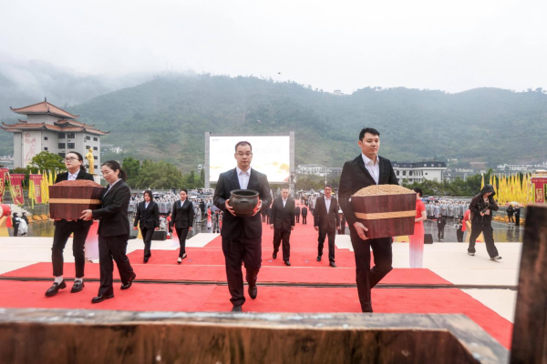 初獻(xiàn)環(huán)節(jié),陳華、王莉凈手禮畢后,緩步走向主舞臺(tái),向歷代祖師宗師獻(xiàn)爵、獻(xiàn)帛。全體敬拜人員行三鞠躬禮,以此傳遞茅臺(tái)人飲水思源、感恩先輩的虔誠(chéng)心意。