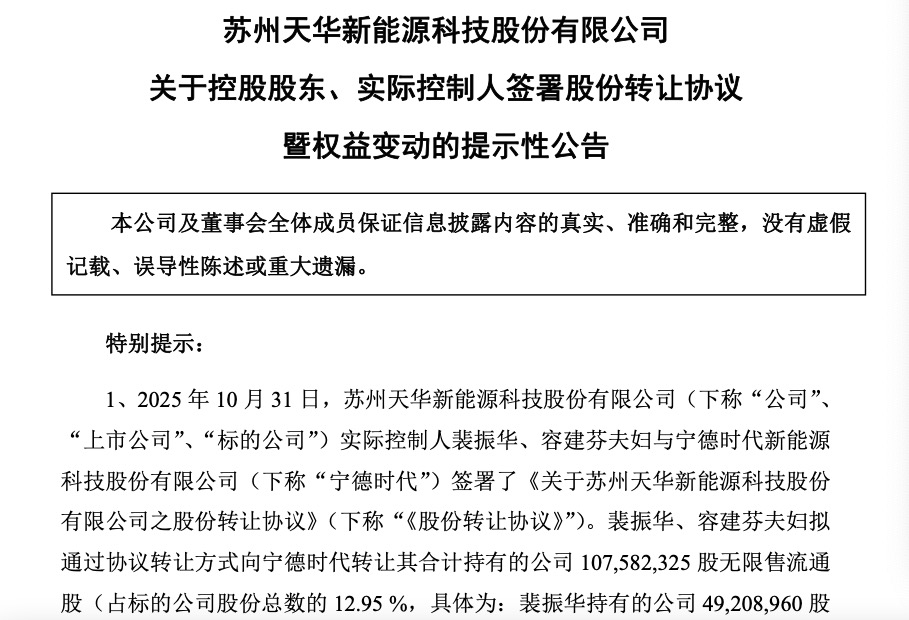 10月31日晚間,蘇州天華新能源科技股份有限公司(以下簡稱“天華新能”,證券代碼:300390)發(fā)布公告,公司實際控制人裴振華、容建芬夫婦與寧德時代新能源科技股份有限公司(以下簡稱“寧德時代”,證券代碼:300750)簽署股份轉讓協(xié)議,前者擬通過協(xié)議轉讓方式向寧德時代轉讓合計1.08億股無限售流通股,占天華新能股份總數(shù)的12.95%,轉讓總價高達26.35億元,每股轉讓價格為24.49元。交易完成后,寧德時代將持有天華新能13.54%的股份,成為其重要戰(zhàn)略股東。