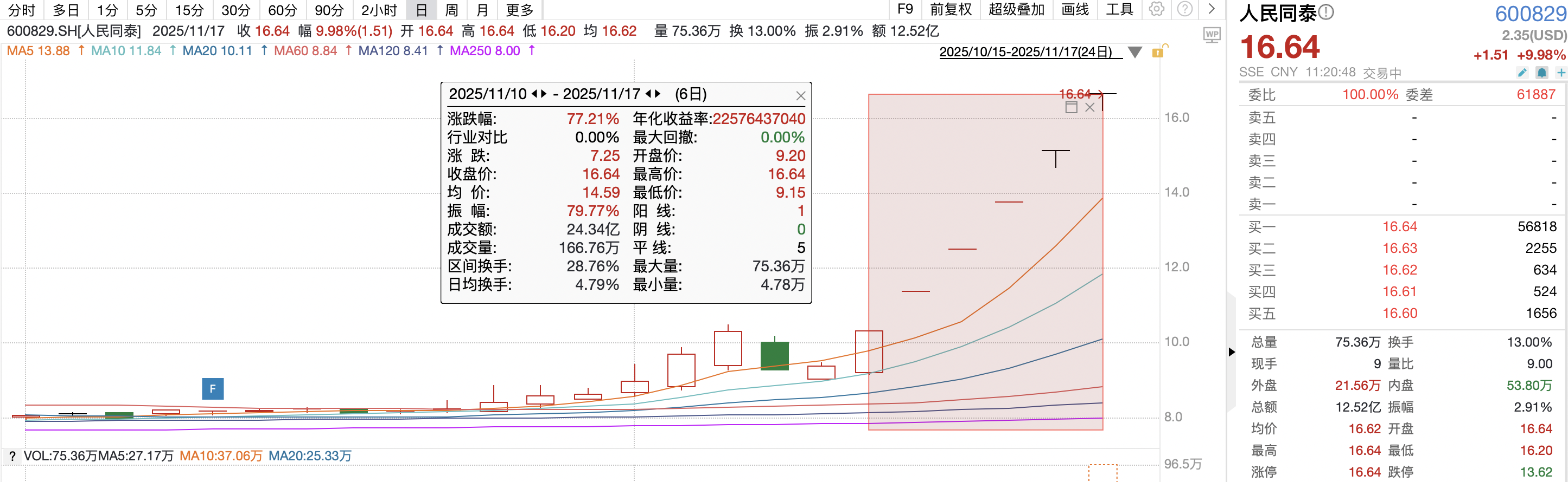 Wind數(shù)據(jù)顯示,截至11月17日午間收盤,人民同泰已連續(xù)6個交易日漲停,公司股價從11月10日的9.20元/股一路飆升至11月17日的16.64元/股,累計漲幅高達77.21%,總市值達到96億元。
