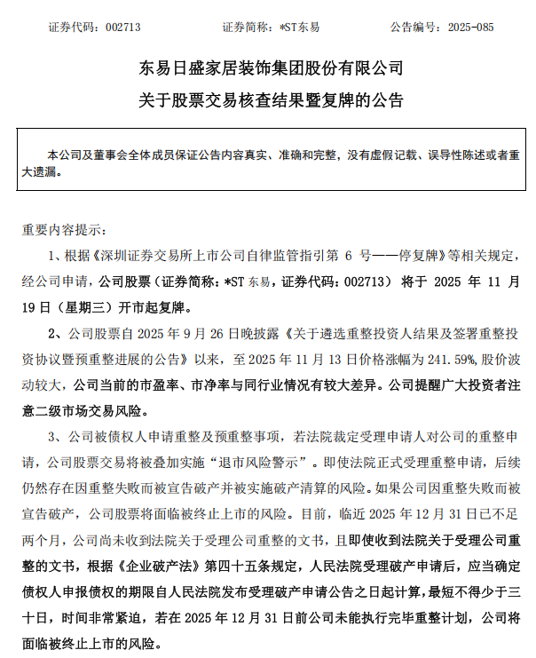 公告顯示,公司股票自2025年9月26日晚披露《關(guān)于遴選重整投資人結(jié)果及簽署重整投資協(xié)議暨預(yù)重整進(jìn)展的公告》以來,至2025年11月13日價格漲幅為241.59%。為維護(hù)投資者利益,公司股票自2025年11月14日開市起停牌核查,于2025年11月19日(星期三)開市起復(fù)牌。