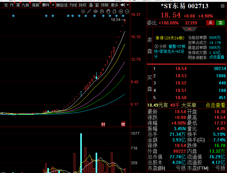 經(jīng)過三個交易日停牌核查后,11月19日,東易日盛家居裝飾集團(tuán)股份有限公司(證券簡稱:*ST東易,證券代碼:002713)復(fù)牌后再度漲停,創(chuàng)下29個交易日內(nèi)24次漲停紀(jì)錄。截至午間收盤,公司股價從9月26日收盤價的5.17元/股漲至18.54元/股,漲幅達(dá)258.61%。