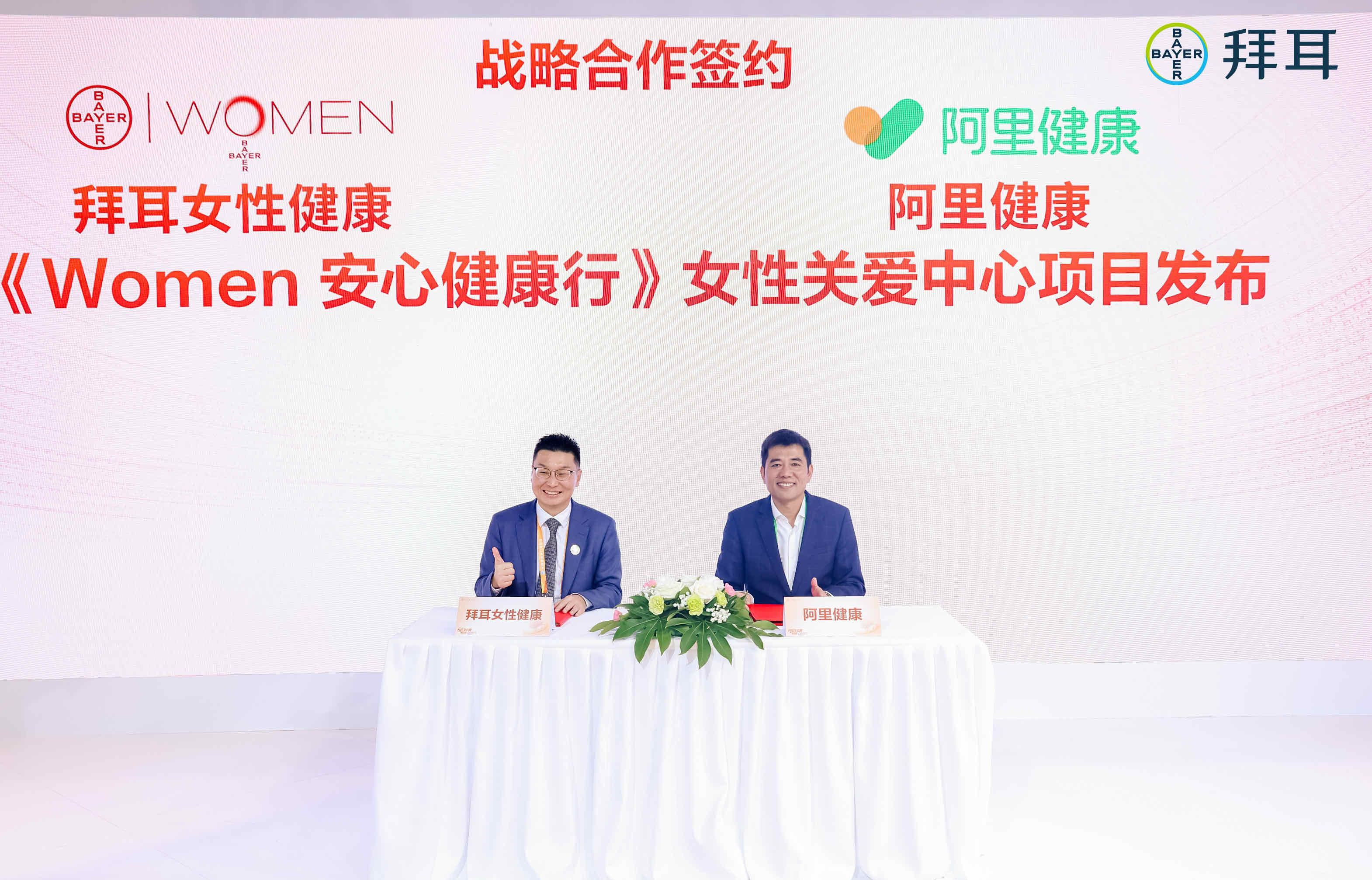 阿里健康自營事業(yè)部總經理、藥品平臺業(yè)務部總經理章澤(右)和拜耳集團處方藥事業(yè)部副總裁、中國女性健康業(yè)務總經理袁俊杰(左)代表簽約