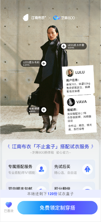 為讓單次免費(fèi)權(quán)益更具質(zhì)感,江南布衣全域服務(wù)體系全程護(hù)航:線上端提供5天免費(fèi)試穿期,試穿不滿意可一鍵退回,來回運(yùn)費(fèi)全免,全程搭配師專屬1v1服務(wù),解答穿搭疑問。芝麻800+用戶完成單次服務(wù)后,還可額外解鎖江南布衣會(huì)員身份,同享品牌雙倍積分(可兌換禮品、護(hù)理、線下活動(dòng)名額等等),讓“單次體驗(yàn)”延伸出長(zhǎng)期價(jià)值。