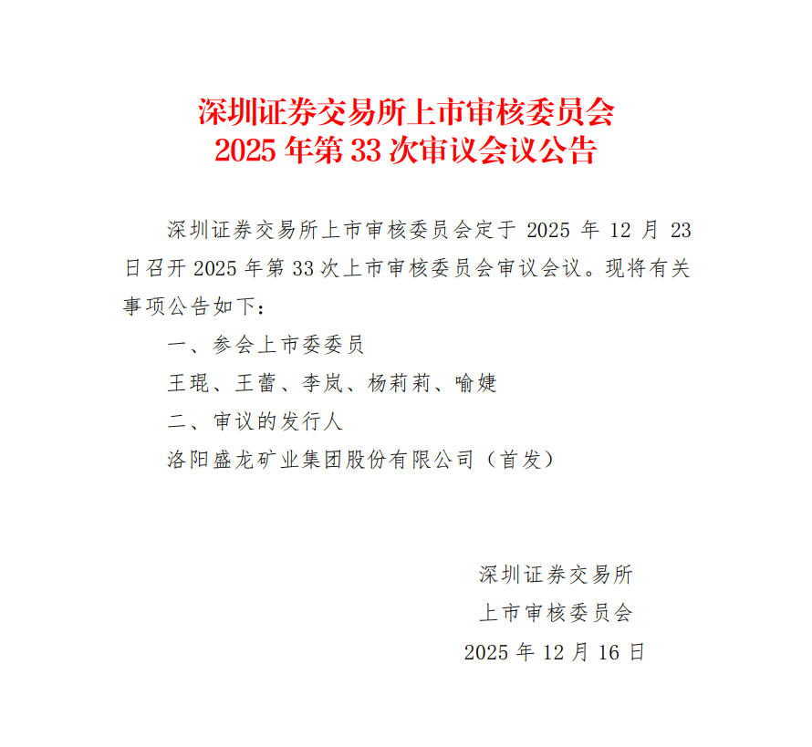 本報(bào)訊 (記者肖艷青)12月16日,深圳證券交易所公告顯示,深圳證券交易所上市審核委員會(huì)定于2025年12月23日召開2025年第33次上市審核委員會(huì)審議會(huì)議,審議洛陽盛龍礦業(yè)集團(tuán)股份有限公司(首發(fā))(以下簡稱“盛龍股份”)。
