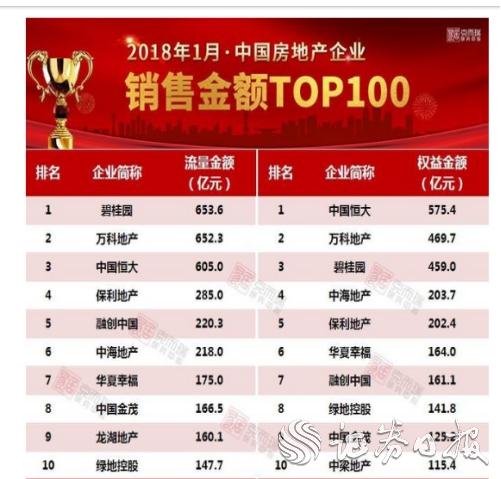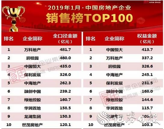 近日,克而瑞公布2019年1月中國房地產(chǎn)企業(yè)銷售TOP100排行榜。榜單顯示,榜首易主,萬科替代碧桂園(02202)拔得開年頭籌,新城控股無緣前十,世茂房地產(chǎn)(00813)再度挺進前十。