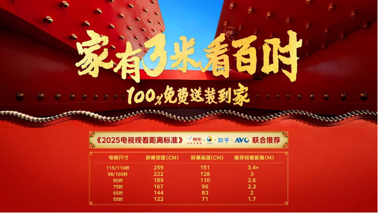活動期間,京東聯(lián)合視像協(xié)會、知乎、奧維共同發(fā)布《2025電視觀看距離標準》,百吋電視的推薦觀看距離為3米。