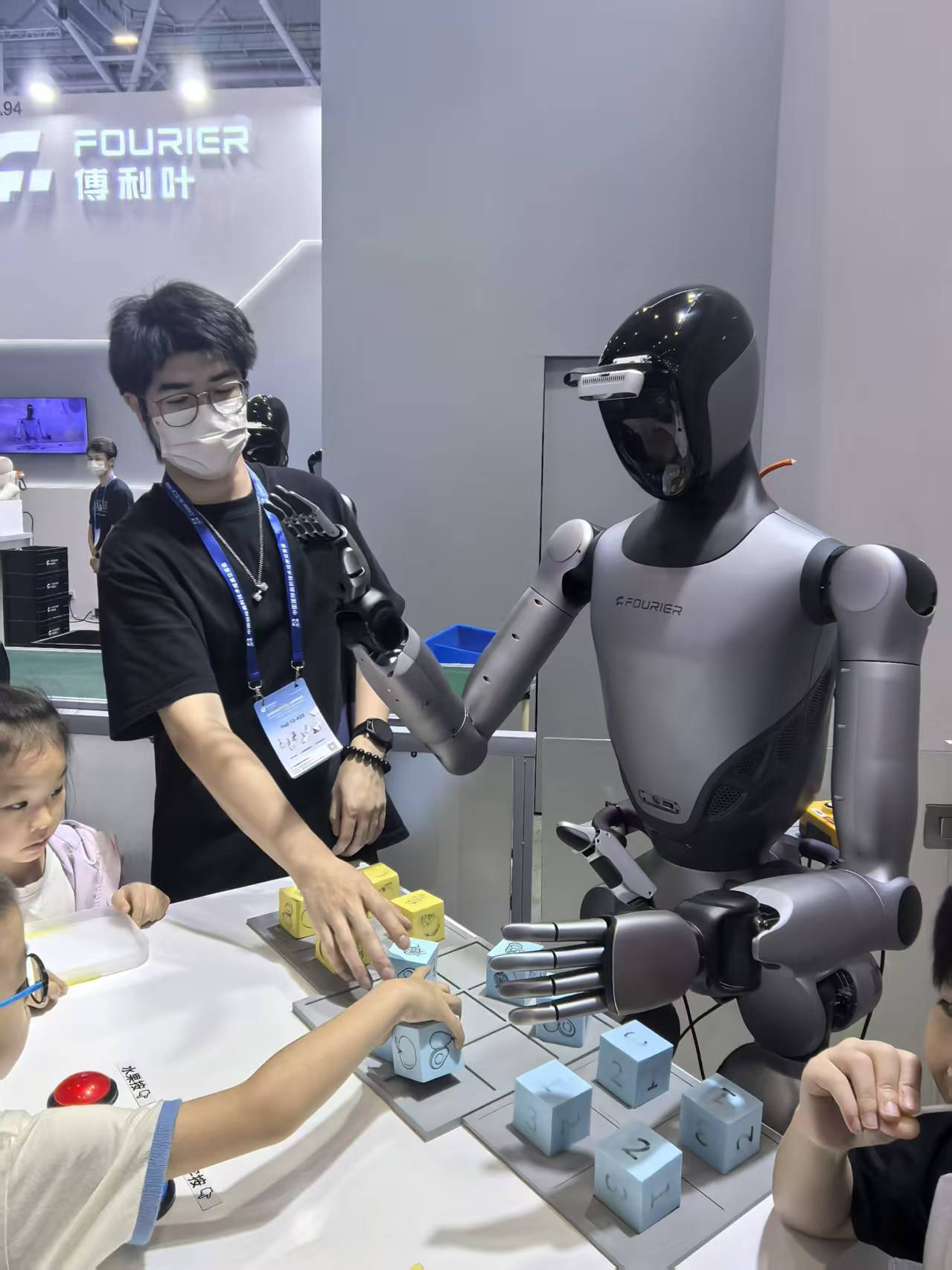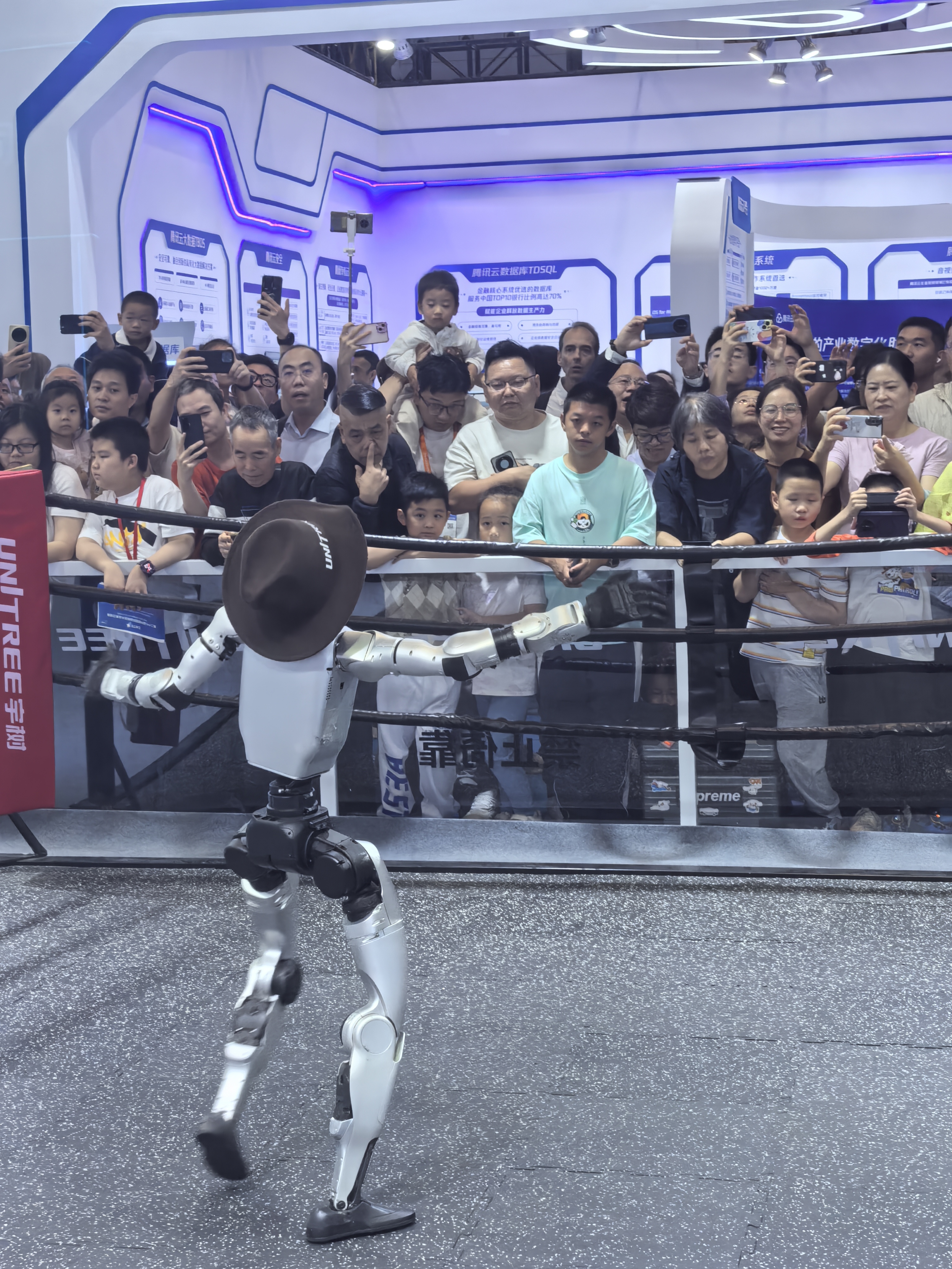 即使開展最后一天,機(jī)器人展區(qū)仍舊人頭攢動(dòng),熱度絲毫不減。在宇樹科技股份有限公司(以下簡(jiǎn)稱“宇樹”)展區(qū),機(jī)器人格斗比賽開賽前半小時(shí),游客已將展位圍得水泄不通。小朋友則聚集在上海傅利葉智能科技股份有限公司(以下簡(jiǎn)稱“傅利葉”)展區(qū),與機(jī)器人比拼“井字棋”,一旁深圳市眾擎機(jī)器人科技有限公司等企業(yè)的“機(jī)器人軍團(tuán)”巡游,展現(xiàn)出穩(wěn)健的運(yùn)動(dòng)和應(yīng)變能力。