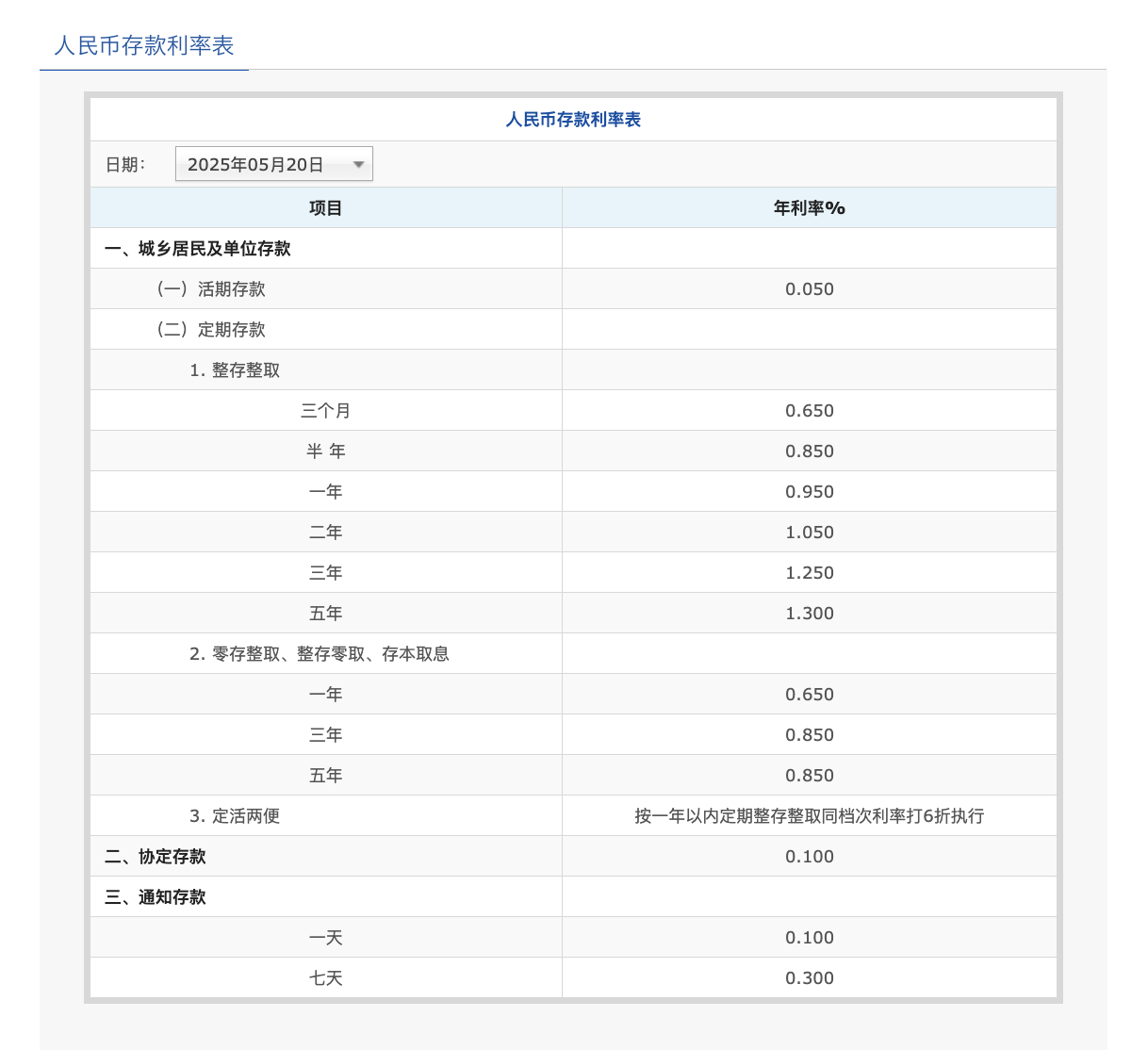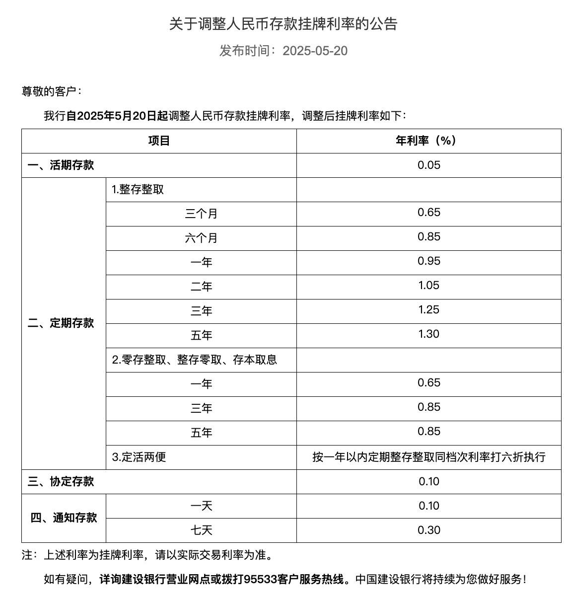 全國性股份制銀行方面,招商銀行5月20日也公布了最新存款掛牌利率表,對人民幣存款利率進行下調(diào)。其中,活期利率下調(diào)5個基點為0.05%;3個月、6個月、1年期、2年期、3年期、5年期定期存款利率(整存整?。?.65%、0.85%、0.95%、1.05%、1.25%、1.3%。