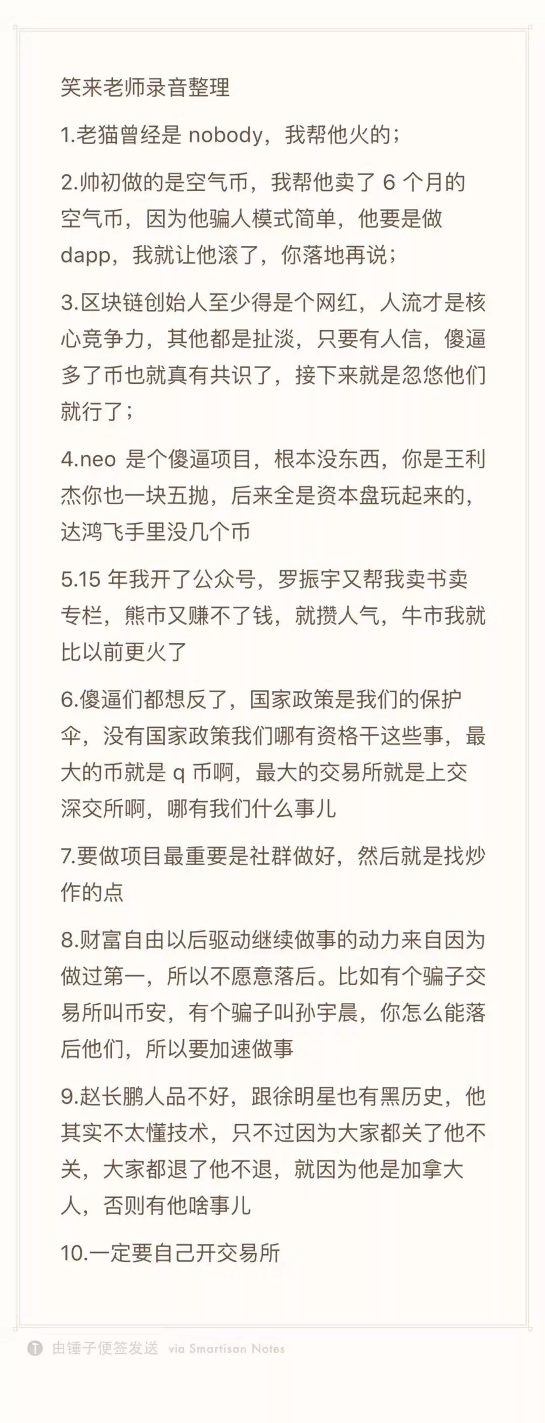 這段錄音中,李笑來談話涉及多位區(qū)塊鏈項目和幣圈人物,比如老貓、neo、以太坊、Ripple、易理華、羅振宇等人。