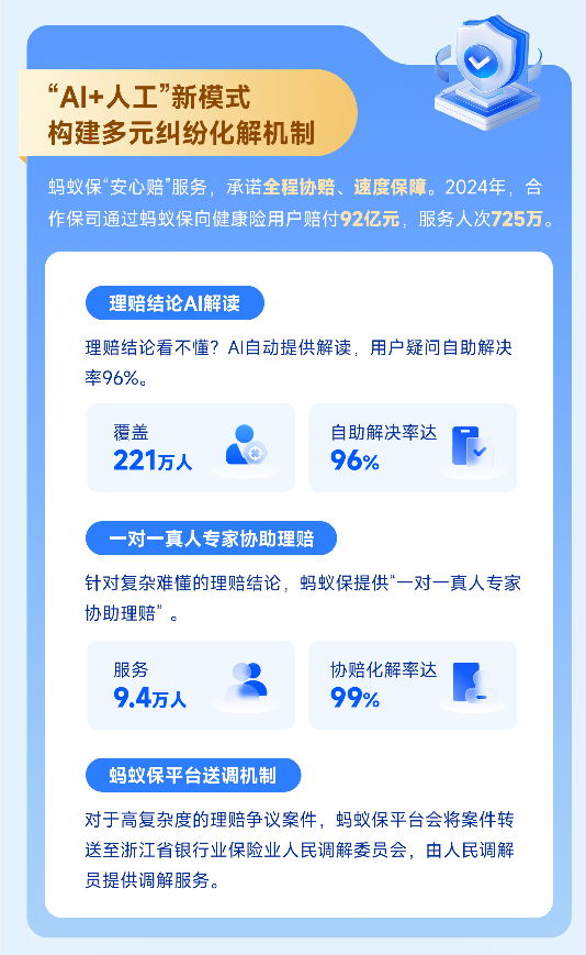 據(jù)介紹,2024年螞蟻保的“AI自助解讀”共為221萬(wàn)用戶提供了理賠結(jié)論解讀,用戶疑問自助解決率96%;“真人協(xié)賠專家”則為理賠糾紛用戶提供理賠協(xié)助服務(wù),2024年服務(wù)9.4萬(wàn)名用戶,協(xié)賠化解率達(dá)99%。