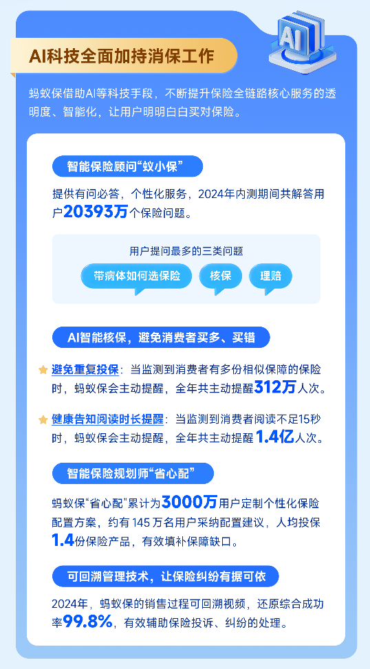 AI方面,螞蟻保上線了智能保險(xiǎn)顧問“蟻小保”、AI智能核保、AI自助解讀等AI應(yīng)用,僅蟻小保在內(nèi)測(cè)期間就解答了用戶2萬(wàn)多個(gè)保險(xiǎn)疑問;人工方面,螞蟻保建立了包含協(xié)賠專家的多元糾紛化解機(jī)制,在2024年協(xié)賠專家累計(jì)為7萬(wàn)人次提供一對(duì)一協(xié)助理賠服務(wù)。