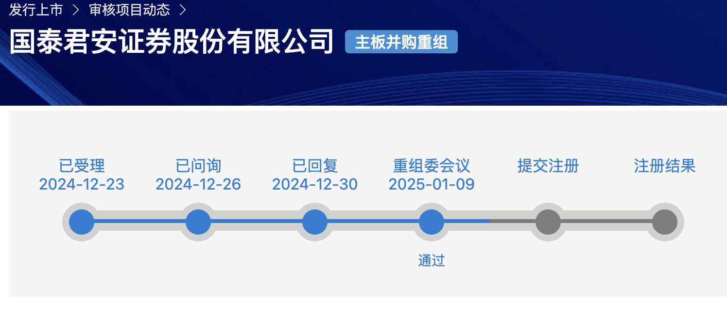 1月9日,上海證券交易所并購重組審核委員會2025年第1次審議會議結(jié)果公告顯示,國泰君安證券股份有限公司(發(fā)行股份購買資產(chǎn)):本次交易符合重組條件和信息披露要求。這意味著,國泰君安與海通證券本次合并重組交易申請獲交易所審核通過,也是2025年上交所審議的首個并購重組項目。