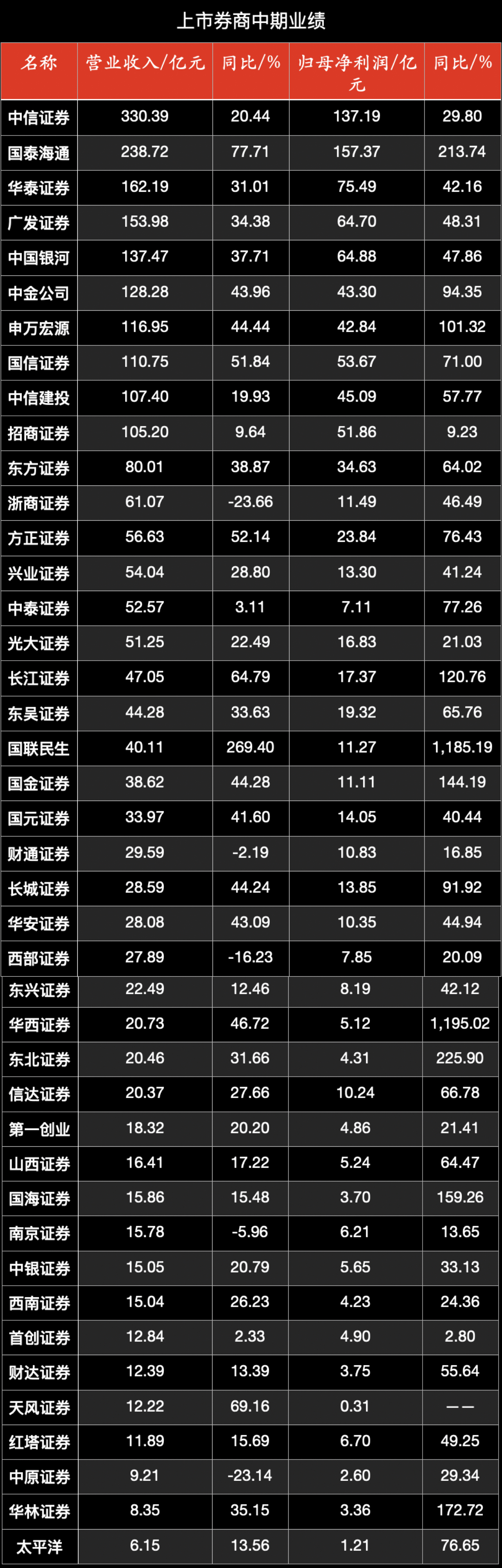 深入分析上半年業(yè)績情況,在42家上市券商中,有37家券商的營業(yè)收入和歸母凈利潤均實現(xiàn)了同比正增長,呈現(xiàn)出“雙增長”的良好局面;中信證券、國泰海通、華泰證券、廣發(fā)證券、中國銀河、中金公司、申萬宏源、國信證券、中信建投、招商證券等十大頭部券商的營業(yè)收入全部超百億元,中信證券、國泰海通兩家公司的歸母凈利潤均超百億元。另外,還有1家上市券商成功扭轉(zhuǎn)虧損局面,實現(xiàn)了歸母凈利潤的扭虧為盈,基本面的修復為行業(yè)整體盈利水平提升注入了增量。