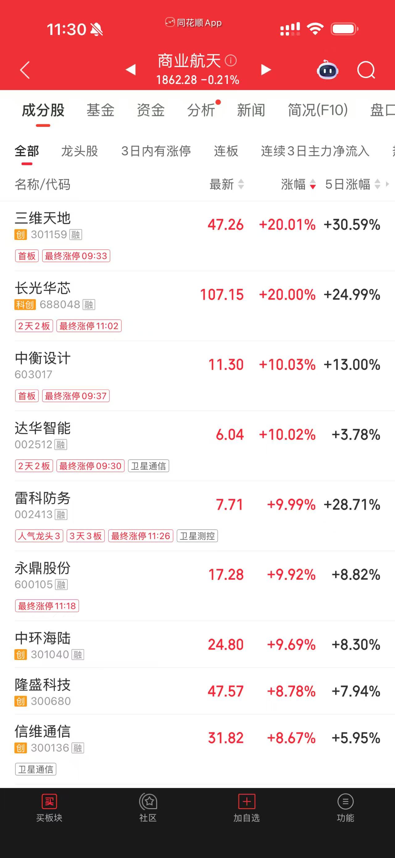 截至上午收盤,三維天地(301159)、長(zhǎng)光華芯(688048)達(dá)成“20cm”漲停,中衡設(shè)計(jì)(603017)、達(dá)華智能(002512)、雷科防務(wù)(002413)、永鼎股份(600105)等多股漲停,中環(huán)海陸(301040)、乾照光電(300102)、信維通信(300136)、隆盛科技(300680)等個(gè)股漲超8%。