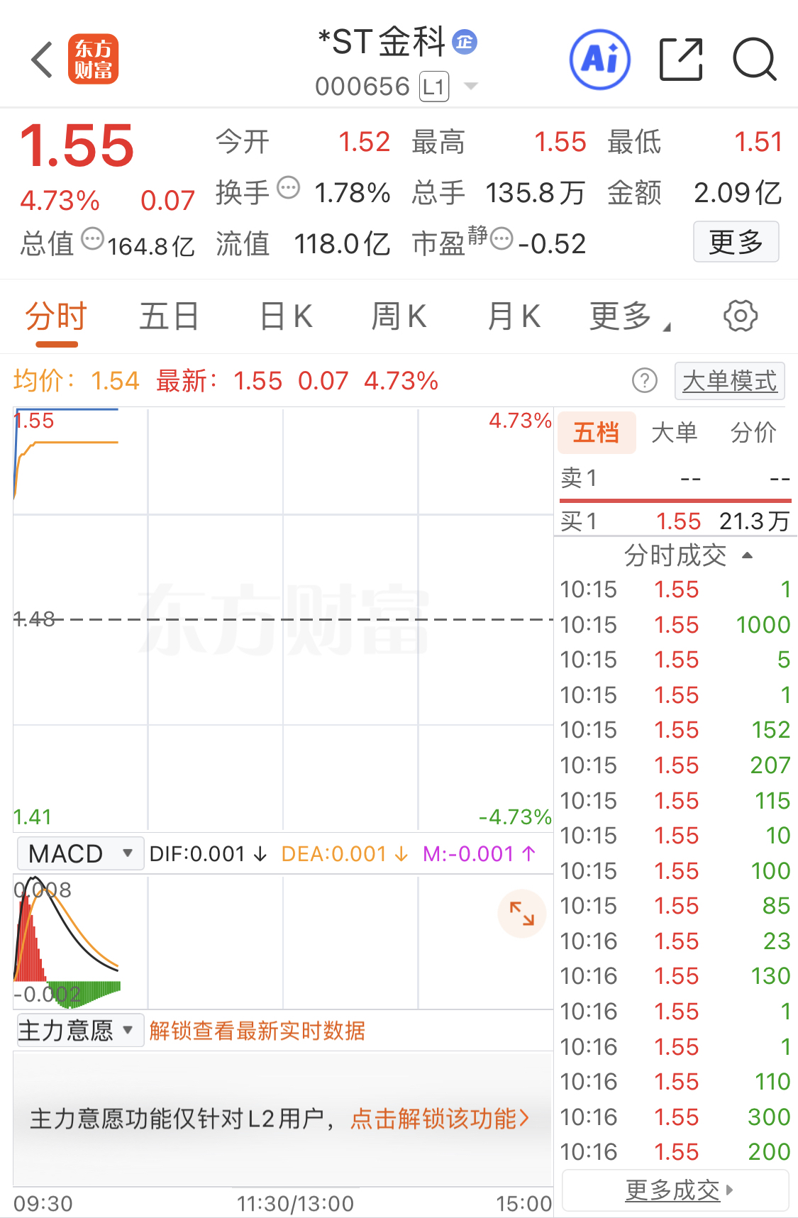 12月16日,*ST金科股價(jià)開(kāi)盤(pán)大幅拉升,最終封于漲停,最新股價(jià)報(bào)1.55元/股,市值164.8億元。12月12日、12月15日、12月16日,該個(gè)股股價(jià)已連續(xù)三個(gè)交易日持續(xù)上漲,累計(jì)漲幅6.16%。