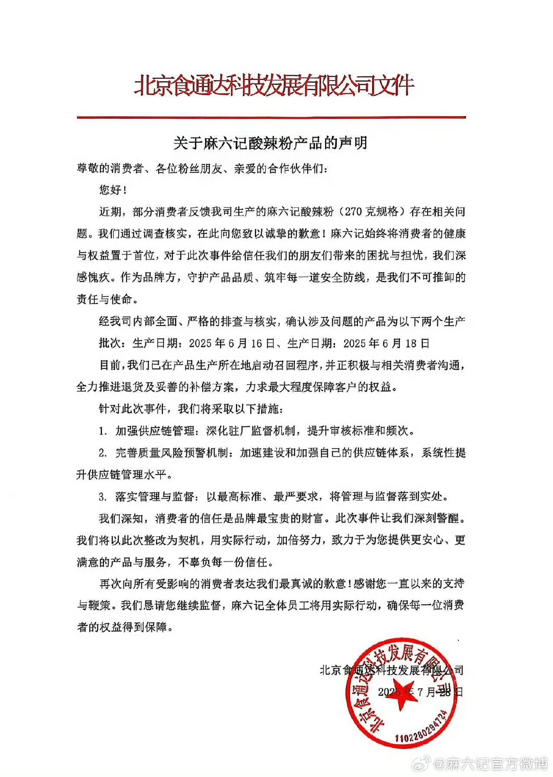 本報訊 (記者李靜)7月28日下午,麻六記官方微博發(fā)表聲明道歉,稱經公司內部排查與核實,確認涉及問題的產品為生產日期為2025年6月16日、6月18日的兩個生產批次。麻六記稱,目前,公司已在產品生產所在地啟動召回程序,并正積極與相關消費者溝通,全力推進退貨及妥善的補償方案,力求最大程度保障客戶的權益。