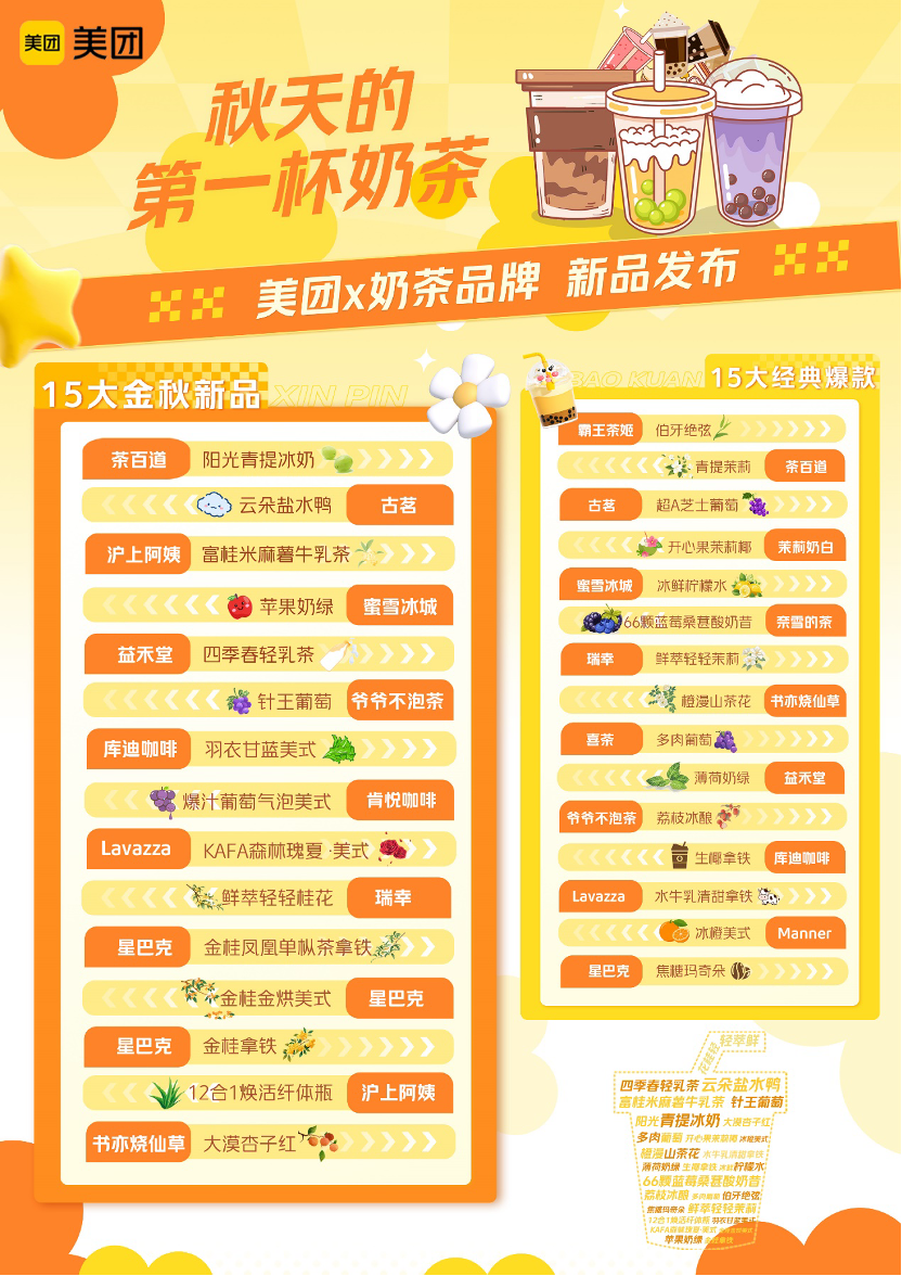 從網(wǎng)絡熱梗到每年“固定節(jié)目”,受年輕人歡迎的“秋天第一杯奶茶”,已經(jīng)連續(xù)5年帶動飲品消費潛力釋放,而各茶飲品牌在“秋天第一杯奶茶”期間,通過美團進行新品首發(fā),已成為行業(yè)重要趨勢。