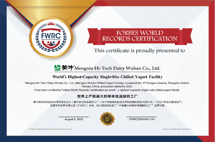 8月8日,以“蒙牛酸奶 世界品質(zhì)”為主題的FWRC福布斯世界紀(jì)錄認(rèn)證新聞發(fā)布會在蒙牛高科乳制品武漢有限責(zé)任公司(以下簡稱“蒙牛低溫武漢工廠”)舉行。