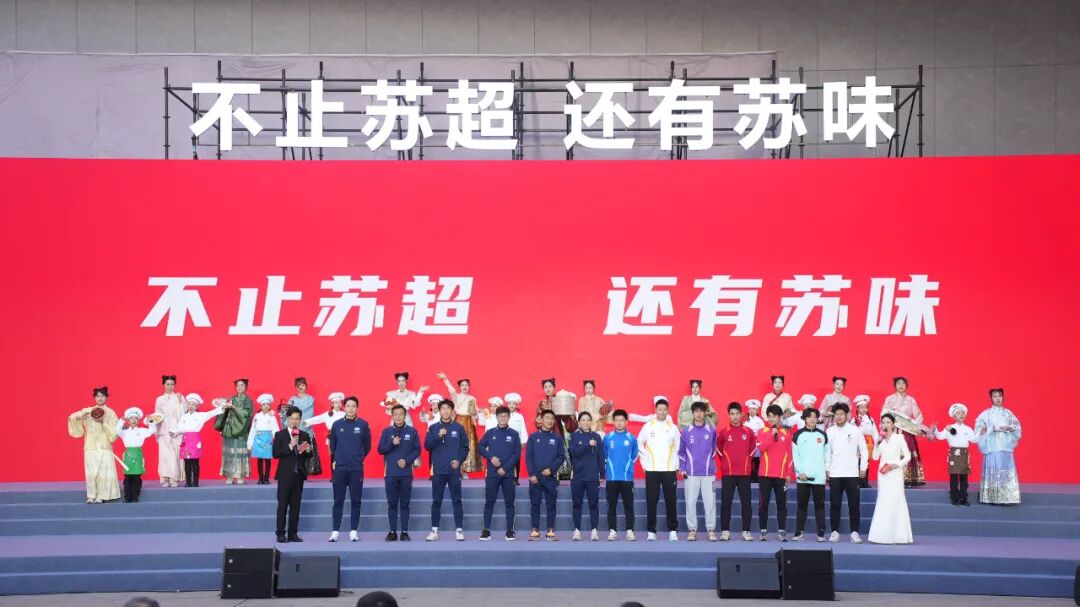 伴隨著開場舞《茉莉芬芳》的演繹,江蘇十三城的風(fēng)味故事一一呈現(xiàn)。啟動(dòng)儀式現(xiàn)場,“蘇超”球隊(duì)的隊(duì)員們化身“美食推薦官”,紛紛為家鄉(xiāng)美食打call。江蘇省作家協(xié)會(huì)副主席祁智、“蘇超”爆款熱梗代言人叨叨傅也前來助陣,從“蘇超”賽場的激情梗王,變身為“蘇味”的探索者。