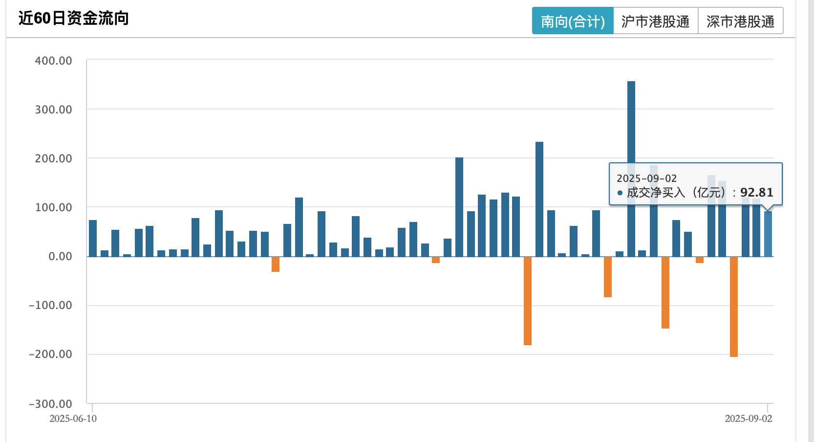 今年以來,南向資金凈流入額超萬億港元。Wind資訊數(shù)據(jù)顯示,截至9月2日收盤,當(dāng)日南向資金凈流入92.81億港元。至此,年內(nèi)南向資金凈流入規(guī)模約10002.21億港元,超過萬億港元。