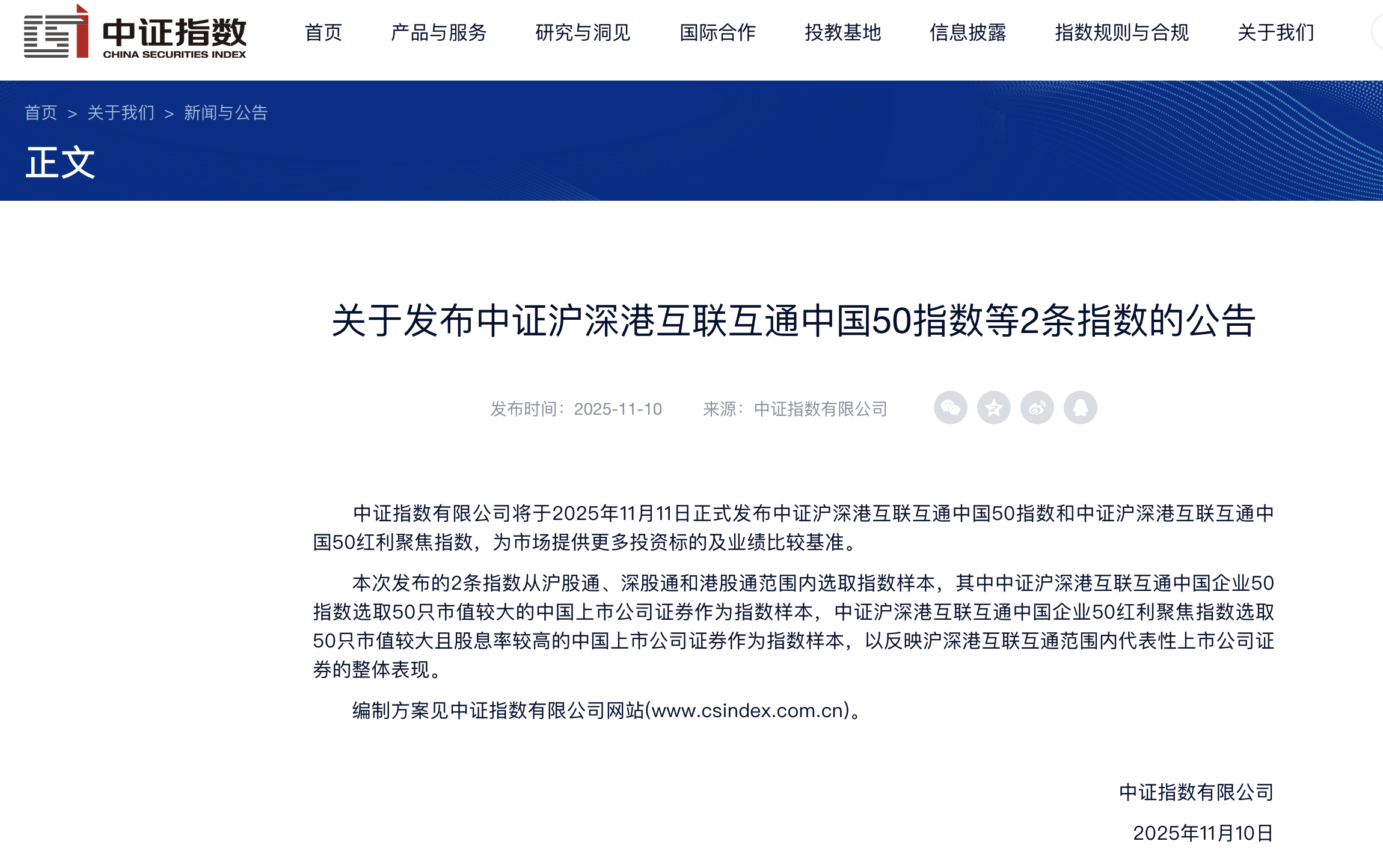 本報(bào)訊 (記者毛藝融)11月10日,中證指數(shù)有限公司在官網(wǎng)公告稱,將于2025年11月11日正式發(fā)布中證滬深港互聯(lián)互通中國50指數(shù)和中證滬深港互聯(lián)互通中國50紅利聚焦指數(shù),為市場提供更多投資標(biāo)的及業(yè)績比較基準(zhǔn)。