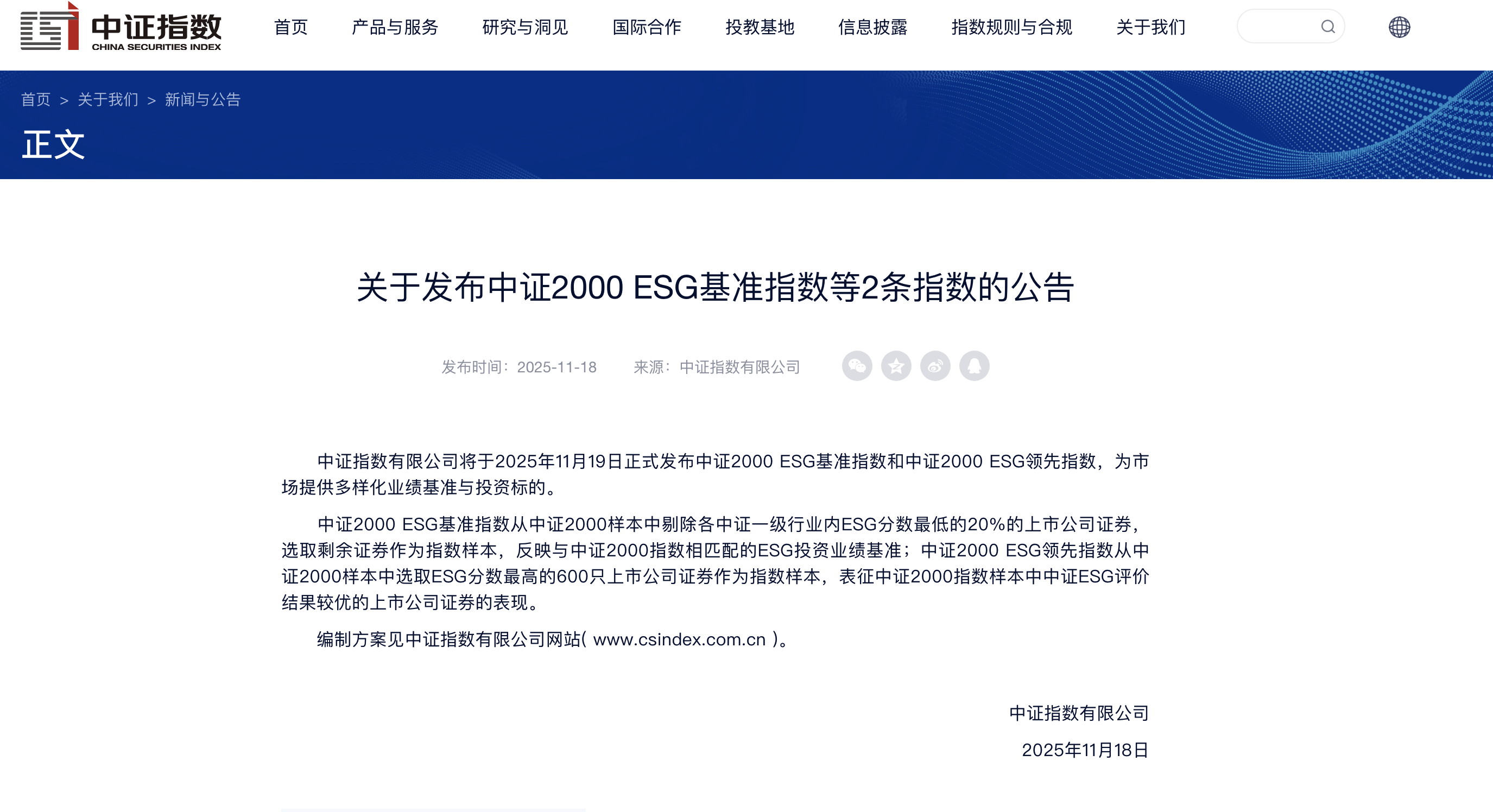 本報(bào)訊 (記者毛藝融)11月18日,中證指數(shù)有限公司官網(wǎng)公告稱,將于2025年11月19日正式發(fā)布中證2000ESG基準(zhǔn)指數(shù)和中證2000ESG領(lǐng)先指數(shù),為市場提供多樣化業(yè)績基準(zhǔn)與投資標(biāo)的。
