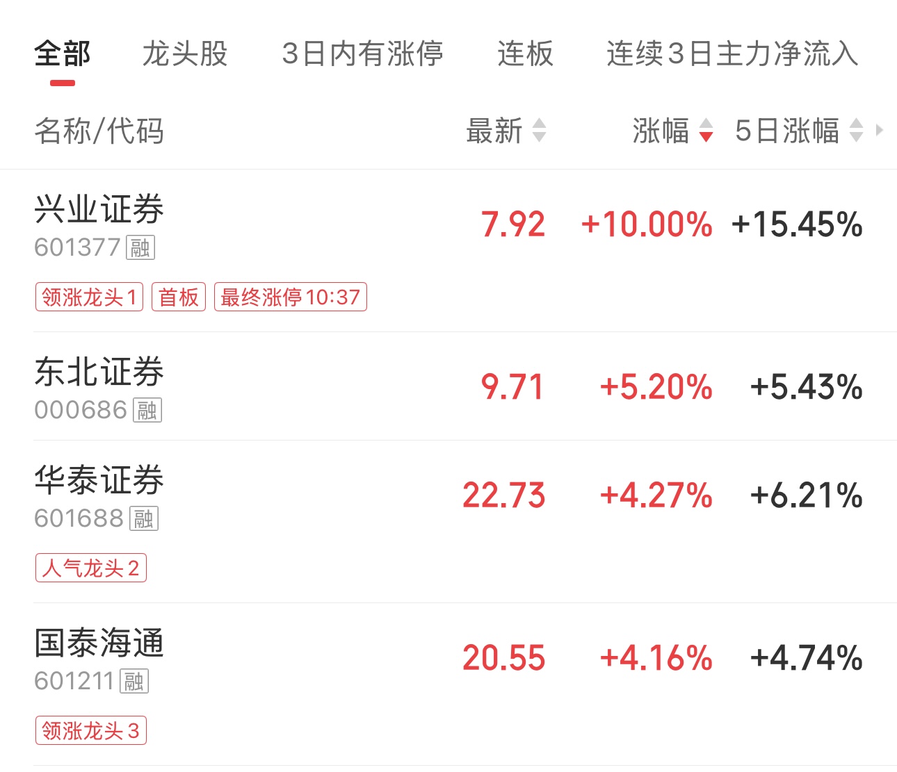 除因并購(gòu)重組事項(xiàng)停牌的中金公司、信達(dá)證券、東興證券外,板塊內(nèi)其余47只個(gè)股全線(xiàn)飄紅,興業(yè)證券漲停,半日成交額達(dá)47.62億元;東北證券漲超5%,華泰證券、國(guó)泰海通均漲超4%;行業(yè)龍頭中信證券半日成交額超65億元。