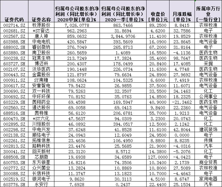進(jìn)一步梳理發(fā)現(xiàn),有30家公司實(shí)現(xiàn)了今年一季報和中報歸屬母公司凈利潤同比雙增長。值得關(guān)注的是,牧原股份、中電電機(jī)、睿創(chuàng)微納、沃華醫(yī)藥、博邁科和ST南糖等6家公司均實(shí)現(xiàn)2019年年報和2020年一季報凈利潤同比雙翻番,成長性凸顯。