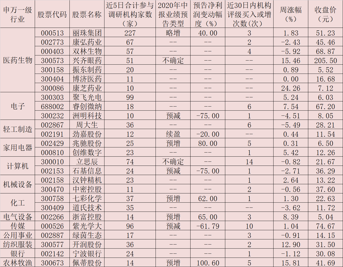 表:近5日獲得10家以上機(jī)構(gòu)調(diào)研的個(gè)股一覽