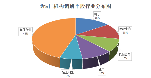 從行業(yè)角度來看,上述近5日獲得機(jī)構(gòu)調(diào)研的71只個(gè)股主要扎堆在電子、醫(yī)藥生物、機(jī)械設(shè)備、化工、輕工制造等五行業(yè),涉及個(gè)股數(shù)量分別為11只、9只、7只、7只、5只。