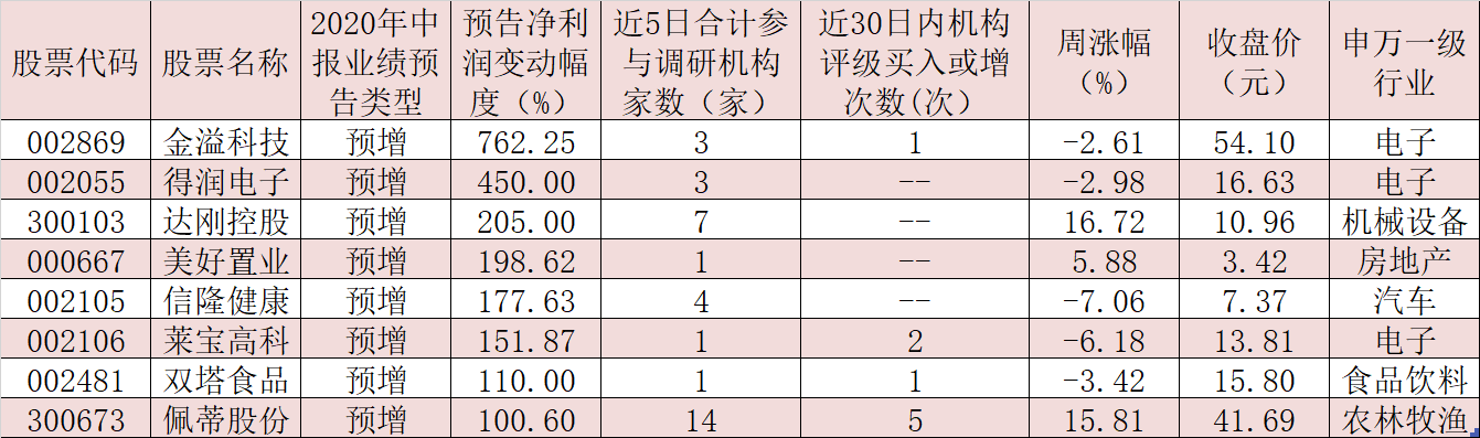 表:近5日被機(jī)構(gòu)調(diào)研的中報(bào)凈利潤(rùn)預(yù)計(jì)翻番股一覽