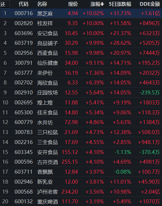食品飲料行業(yè)117只交易個股中,有82只上漲,占比70.09%,其中,有6只個股漲停,11只個股漲幅超5%。其中,西麥?zhǔn)称窛q9.98%,報15.98元。該股自8月25日以來,截至8月31日已連續(xù)5個交易日上漲,累計漲幅達(dá)20.97%。該股最新A股總市值達(dá)35.68億元,A股流通市值35.47億元。