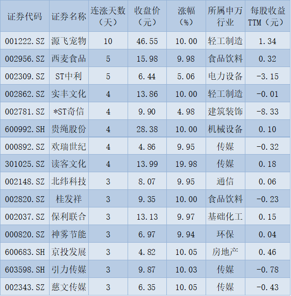 表:連續(xù)上漲3天且今日收盤漲停股一覽
