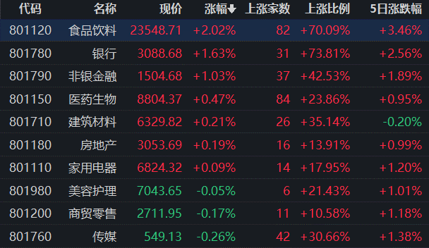 從申萬一級行業(yè)看,31類行業(yè)中有7類上漲,占比22.58%,其中,食品飲料行業(yè)漲幅居前,為2.02%,此外,銀行和非銀金融漲幅也均超1%;跌幅最大的是電力設(shè)備,跌幅為4.78%。