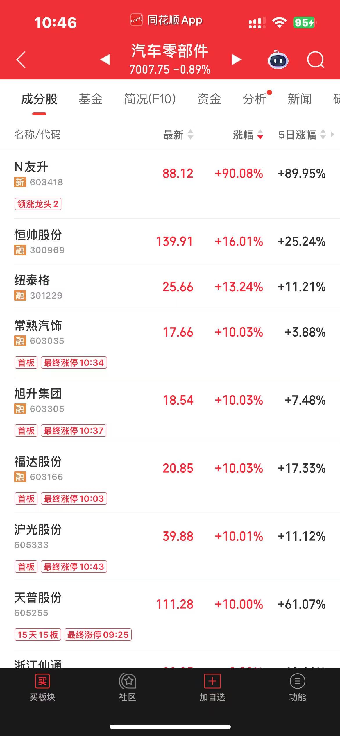 另外,恒帥股份(300969)、紐泰格(301229)、常熟汽飾(603035)、旭升集團(tuán)(603305)、福達(dá)股份(603166)、天普股份(605255)、浙江仙通(603239)、滬光股份(605333)等個(gè)股股價(jià)漲?;驖q幅超過(guò)10%。