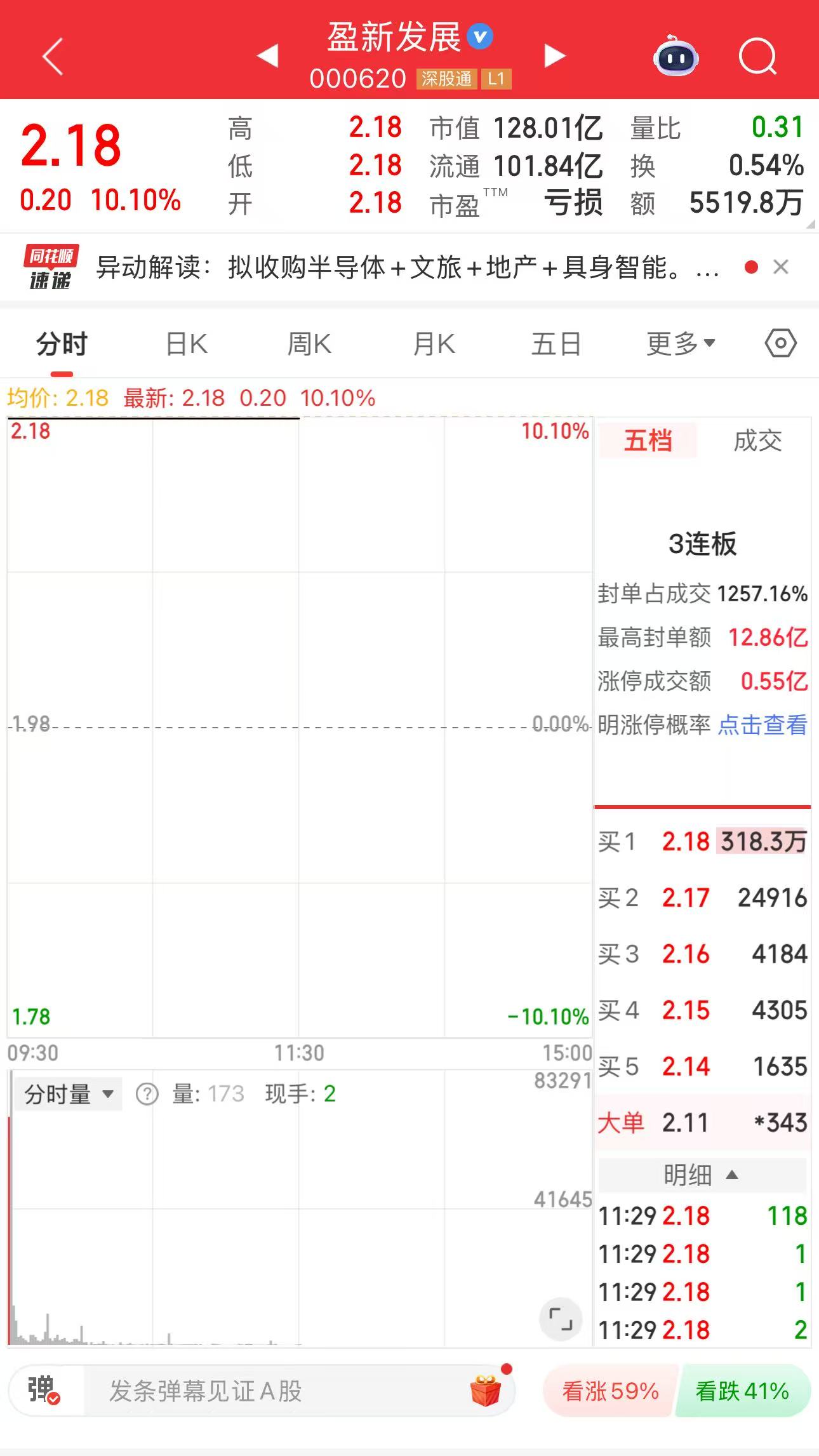 本報(bào)訊 (記者向炎濤)在接連斬獲兩個(gè)漲停板后,10月22日開(kāi)盤(pán),北京銅官盈新文化旅游發(fā)展股份有限公司(以下簡(jiǎn)稱“盈新發(fā)展”,股票代碼:000620)股價(jià)又再次漲停。截至午間收盤(pán),公司股價(jià)報(bào)收于2.18元/股。
